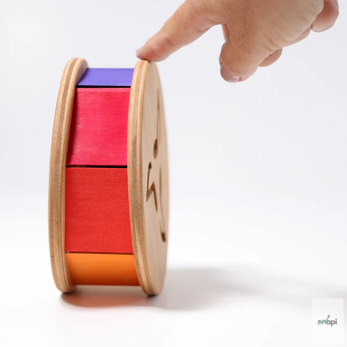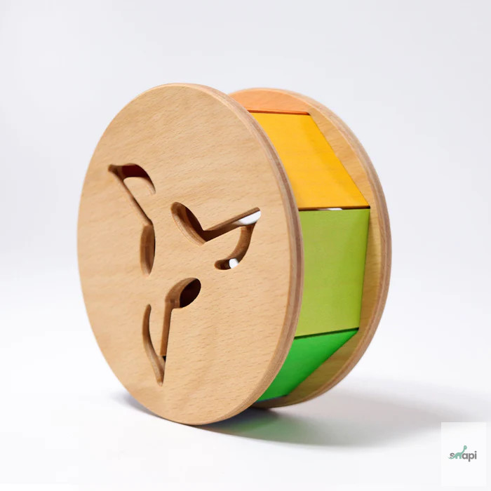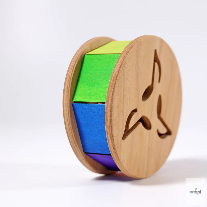 Ez a színes kerék arra ösztönzi a gyerekeket, hogy másszanak és utánajárjanak: a belsejében lévő fagyöngy csörgő hangot ad ki, a színek pedig gurulás közben a szivárvány színeihez hasonlóan változnak. A szivárványlapok fája vékony, így finom hangot adnak.