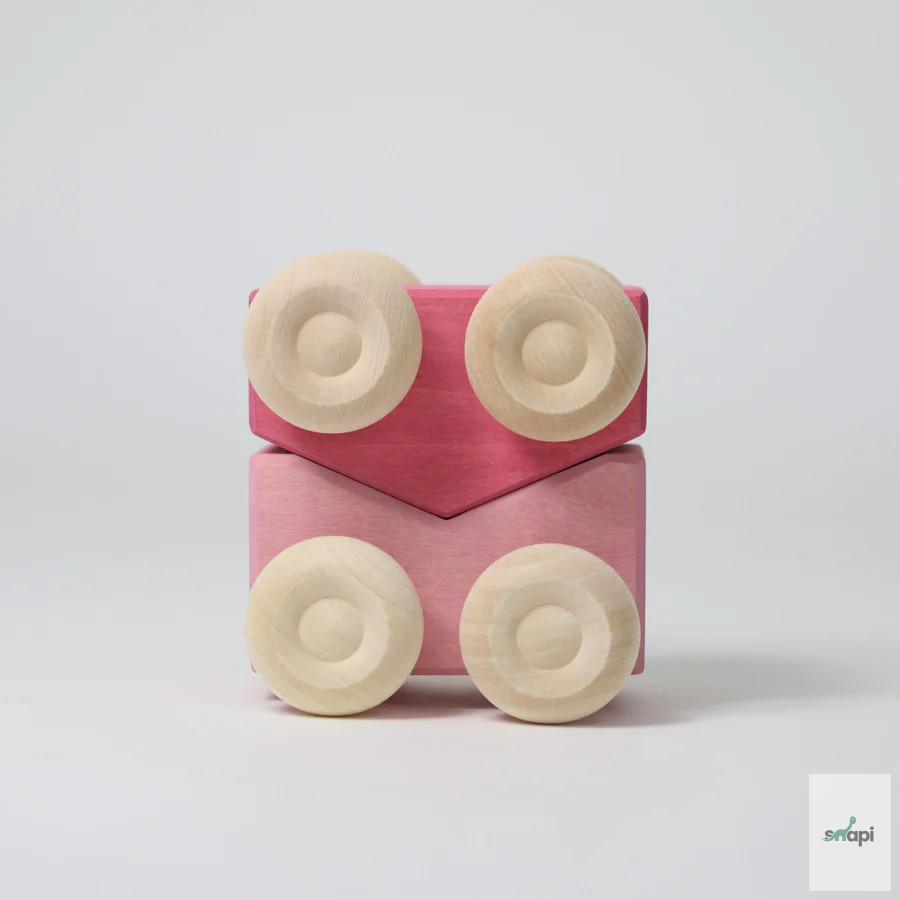 A Grimm's összerakható kisautóik a gyermekjátékok két fő témáját ötvözik: egymásra pakolhatók és gurulhatnak. Más elemekkel is összeépíthetők, majd szállíthatók. A különböző színpárosítások és formavariációk bevezetik a kisgyermekeket a színharmóniákba és a darabok összeillesztésének elvébe.