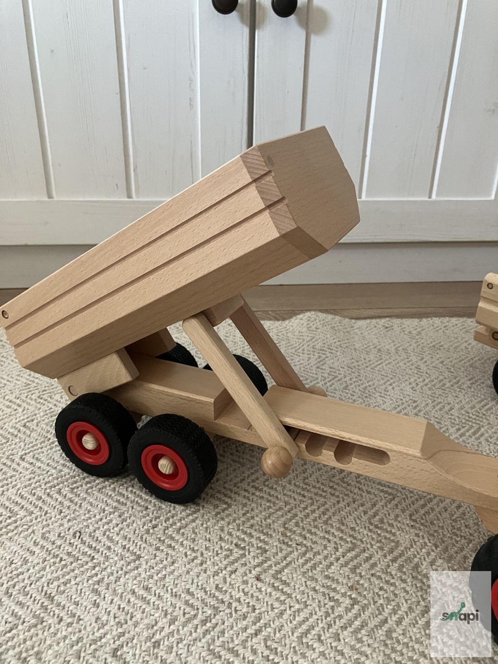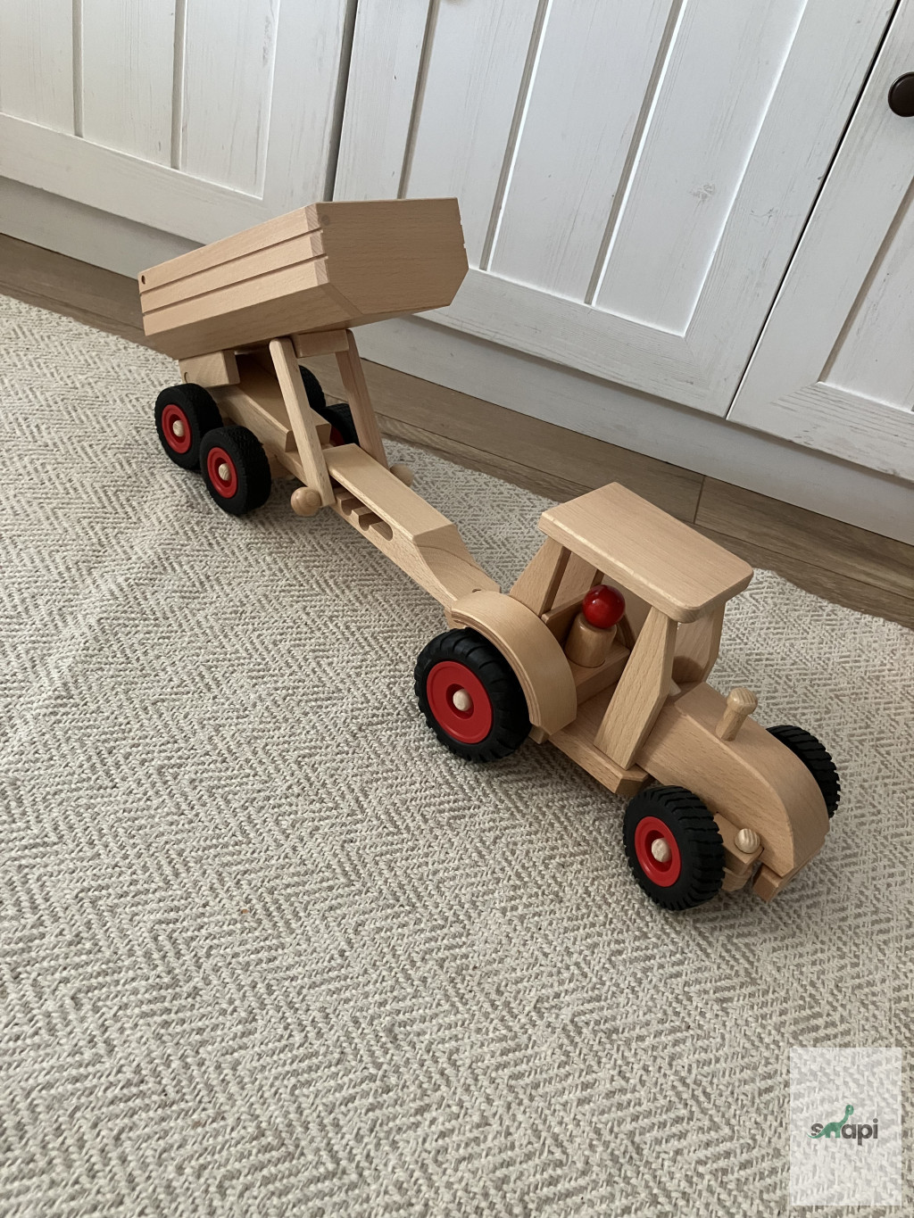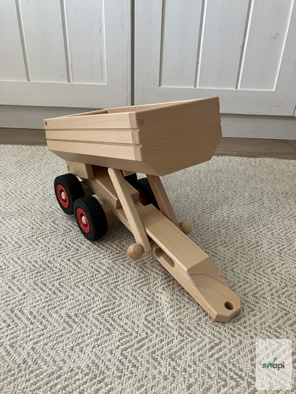 Ez a  játék utánfutó billenő pótkocsival rendelkezik. Könnyen rögzíthető bármely Fagus játékhoz vonóhoroggal, hogy elszállítsa játékait, terméseket vagy akár mandalákat is a kívánt helyre a gyermek, miközben fantáziadús történeteket talál ki. Ennek a pótkocsinak nincs vonóhorga, tehát hátul nem. 12 cm szélességének köszönhetően elfér benne a daru feltét (a 1046-ban nem fér el).