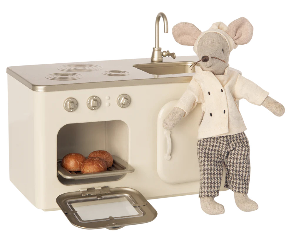 Gyönyörű Maileg miniatűr konyha kötelező darab. A konyhában 3 frissen sült zsemle található a sütőben. Biztosítson sok játékórát ezzel a csodálatos termékkel.