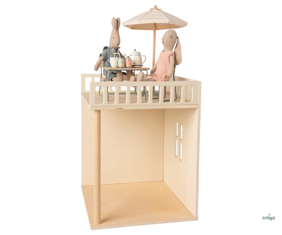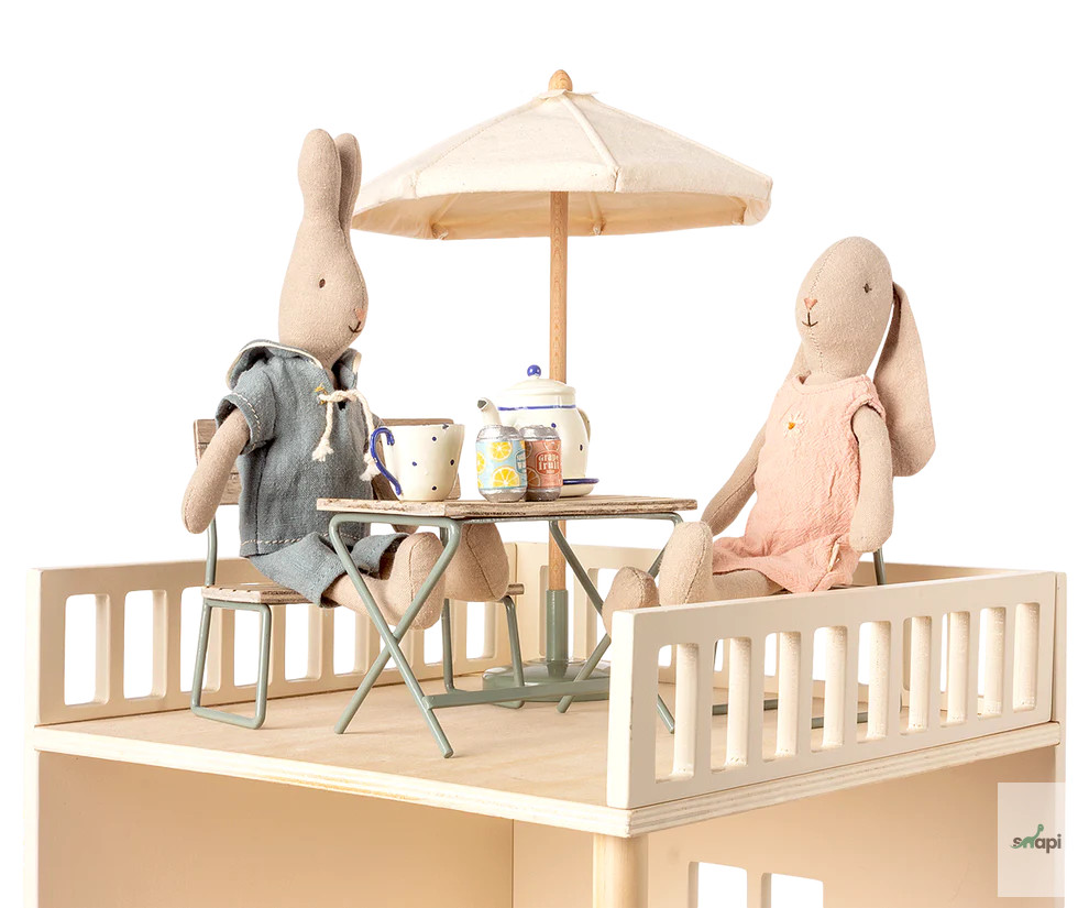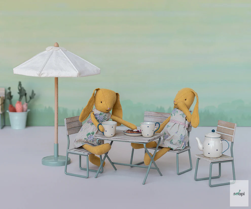 Ne feledkezz meg a kültéri helyiségről sem - ez a kerti szett tökéletes minden nyári összejövetelhez. Vintage megjelenésű, és minden 1-es és 2-es méretű nyuszihoz és nyúlhoz, valamint a Teddy családhoz illik. Az alap fémből, a teteje pedig fából készült.