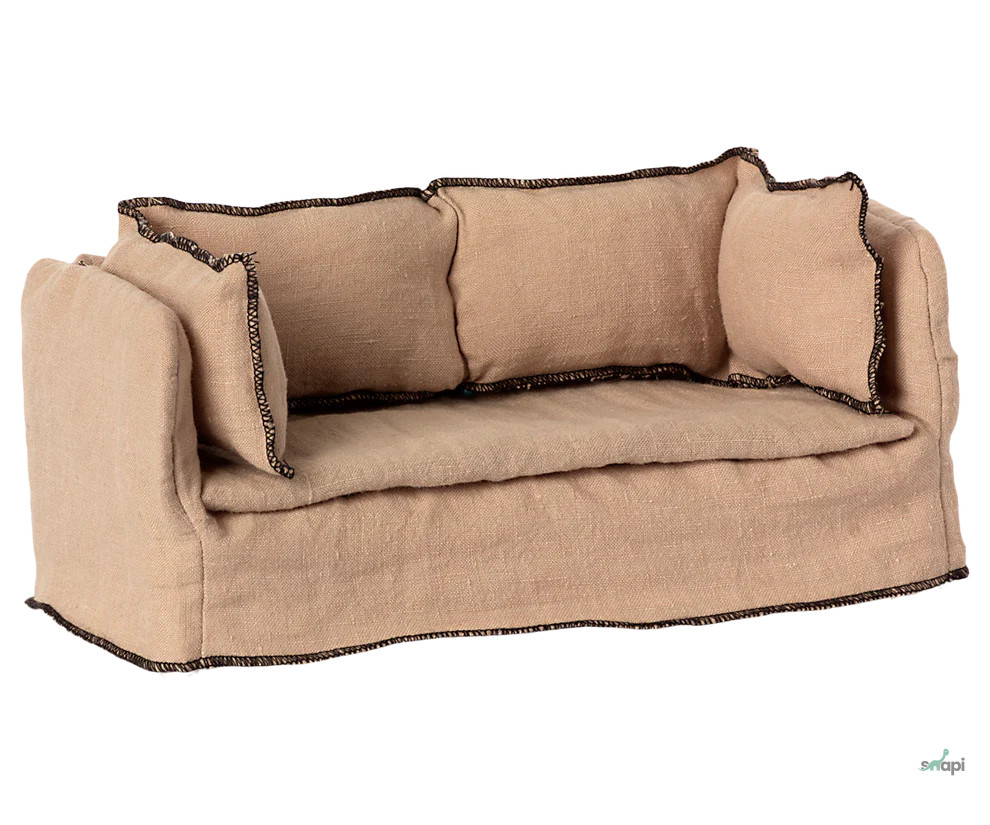 Tartson egy kis szünetet ezen a gyönyörű kanapén. Fából készült közepe és puha huzata gyönyörű lenvászon minőségben készült. Illessze a dohányzóasztalhoz. Tökéletesen illeszkedik a Maileg babaházba.