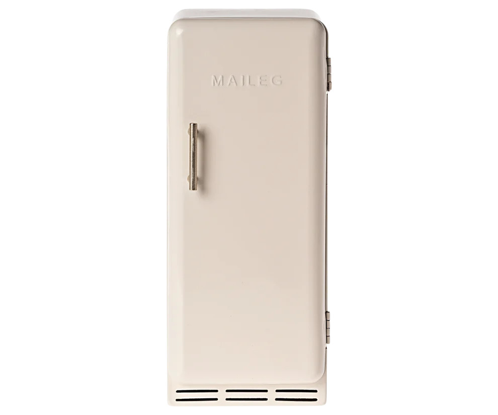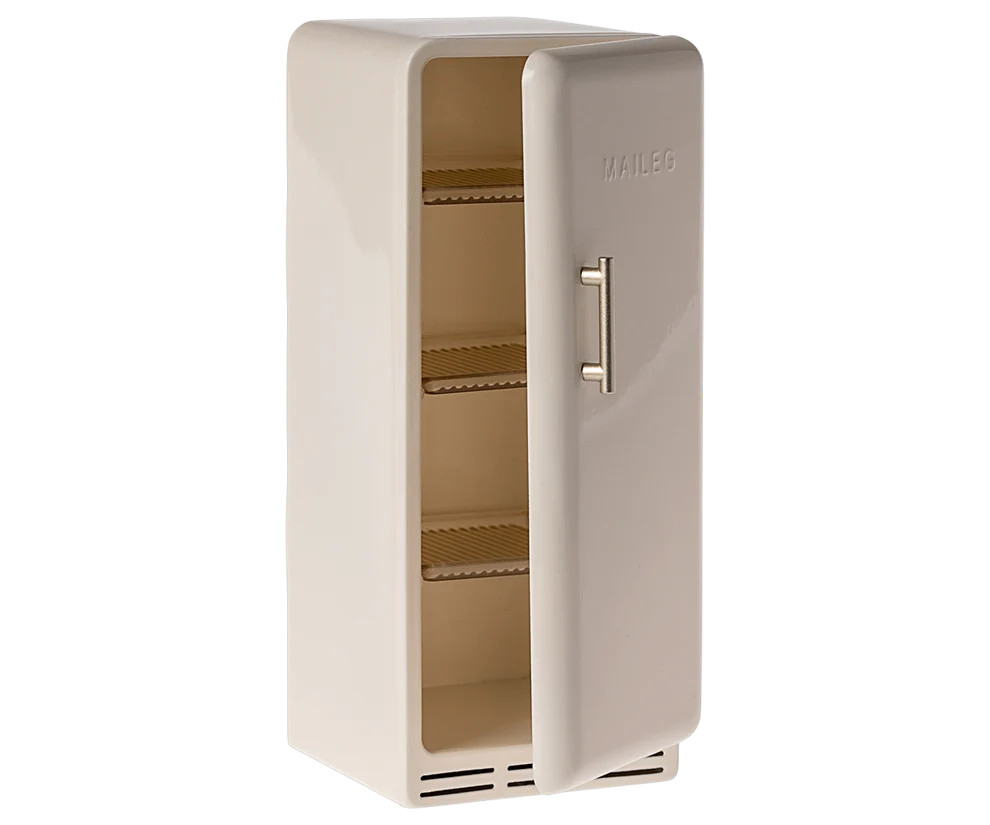 Egy régimódi hűtőszekrény, amely tökéletesen illeszkedik a nagyobb babaházakba. A hűtőszekrény fémből készült, mágneses zárral és matt polcokkal. A hűtőszekrény nagyszerű kiegészítője a miniatűr élelmiszeres doboz.