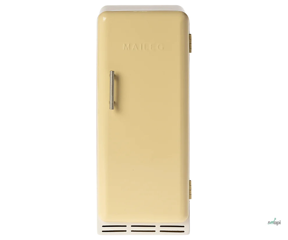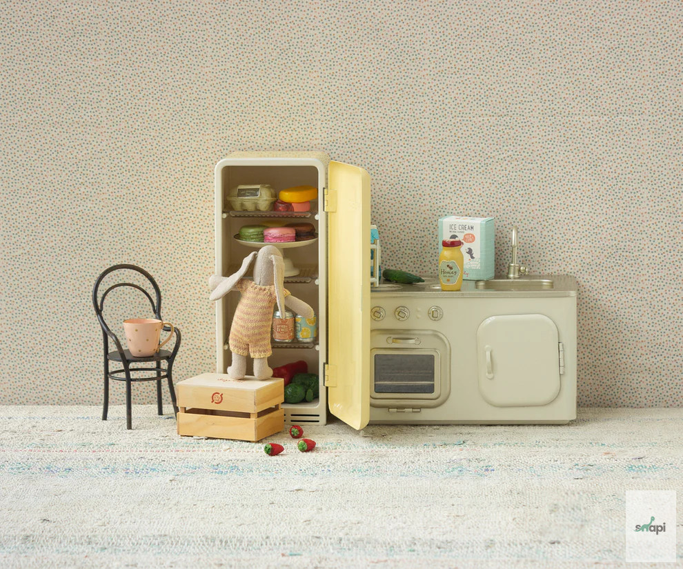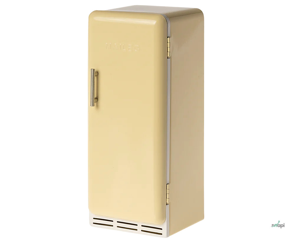 Egy régimódi hűtőszekrény, amely tökéletesen illeszkedik a nagyobb babaházakba. A hűtőszekrény fémből készült, mágneses zárral és matt polcokkal. A hűtőszekrény nagyszerű kiegészítője a miniatűr élelmiszeres doboz.