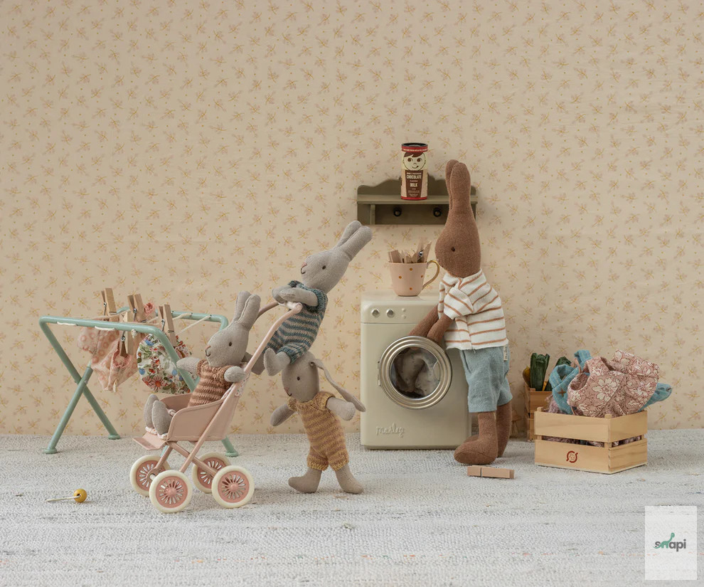 A babakocsi tökéletes kis nyuszi/nyúl méretű babáknak. A kocsi nagyszerű segítség a szerető nyuszi családnak, így magukkal vihetik a babáikat a parkba és a városba tett kirándulásokra.