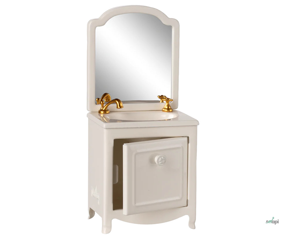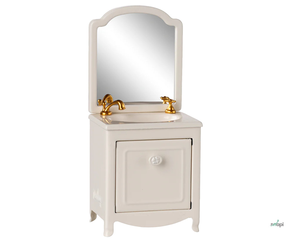 Egy nagyon nélkülözhetetlen darab a Mouse hole Farmhouse fürdőszobájában. Van egy kis szekrény a mosdó alatt, és persze egy tükör is. A Maileg WC-vel és káddal kiegészítve még több játékot lehet játszani.