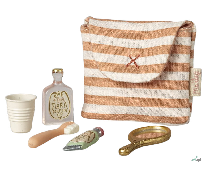 Egy kis táska tele mindennel, amire a lefekvés előtti mindennapi rutinhoz szükséged lehet. Egy fogkefe, egy pohár, egy tükör, egy krém és egy parfümös üveg biztosan tökéletes színhelyet teremt az egércsaládról szóló történeteknek.