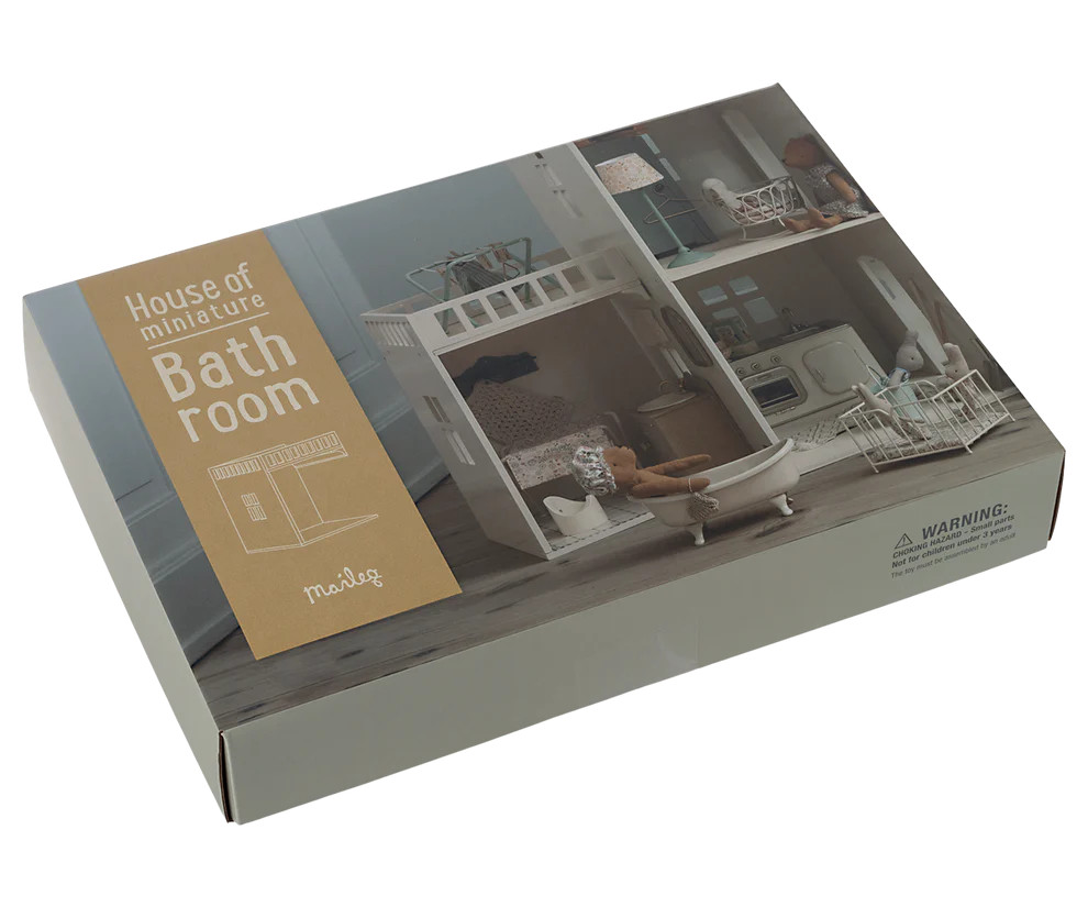 A Maileg miniatűr fürdőszoba szépen díszített padlóval rendelkezik. A dobozban két kis függönyt találsz, amelyekkel Maileg barátaidat privátban tartják.