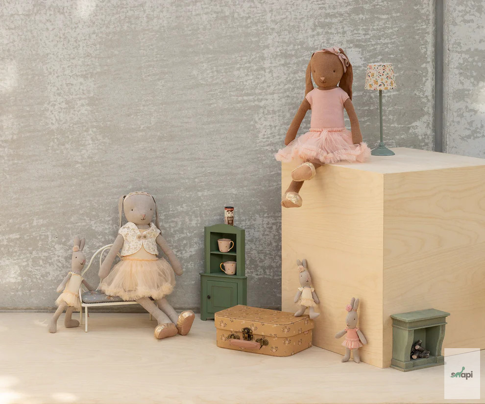 A jól ismert Maileg nyuszi balett-táncosnak öltözött. Rózsaszín kosztümöt, tüll szoknyát és balettcipőket visel.
