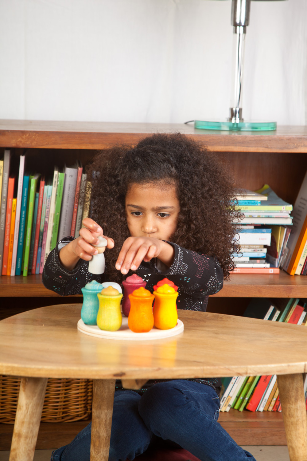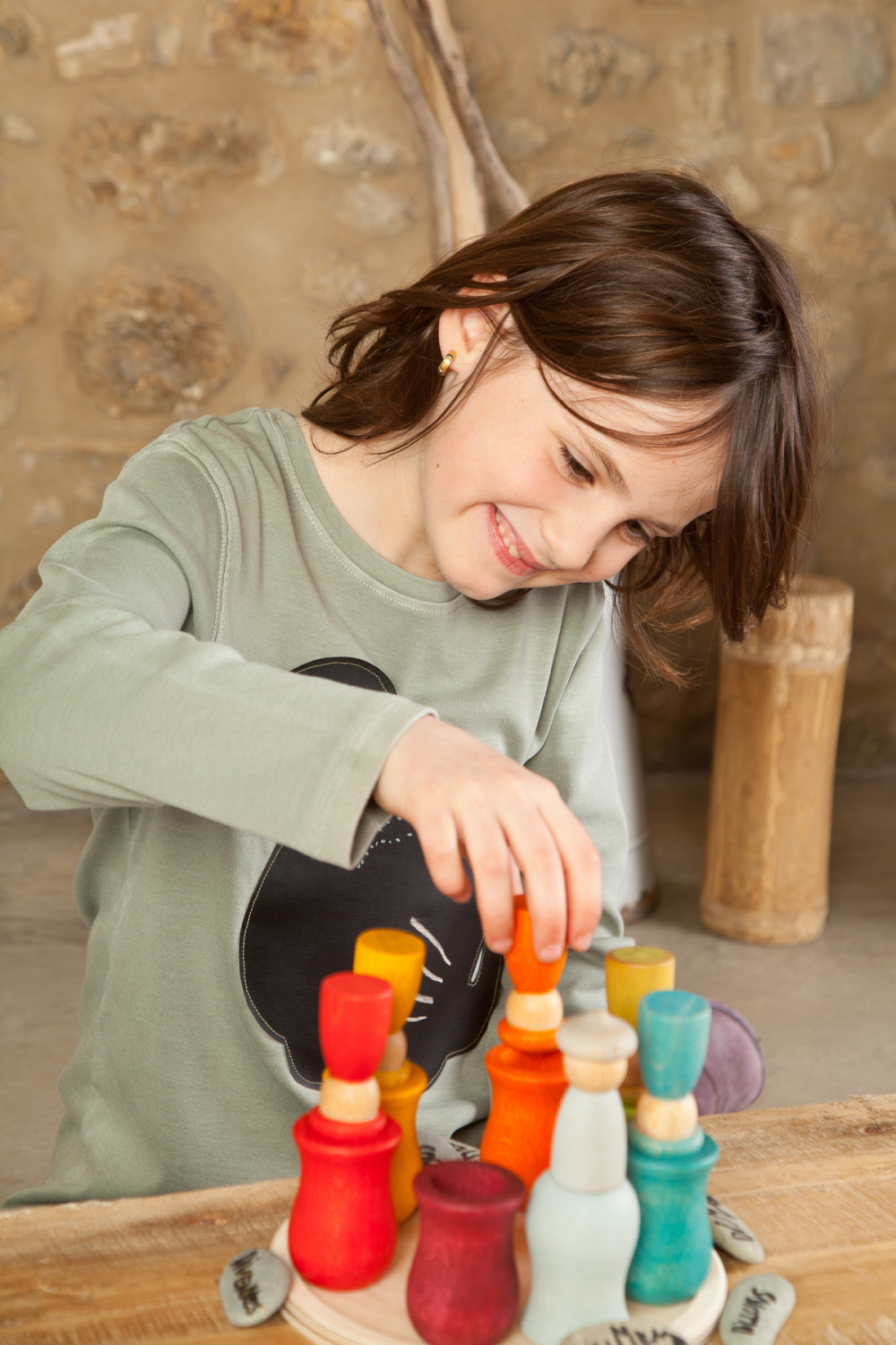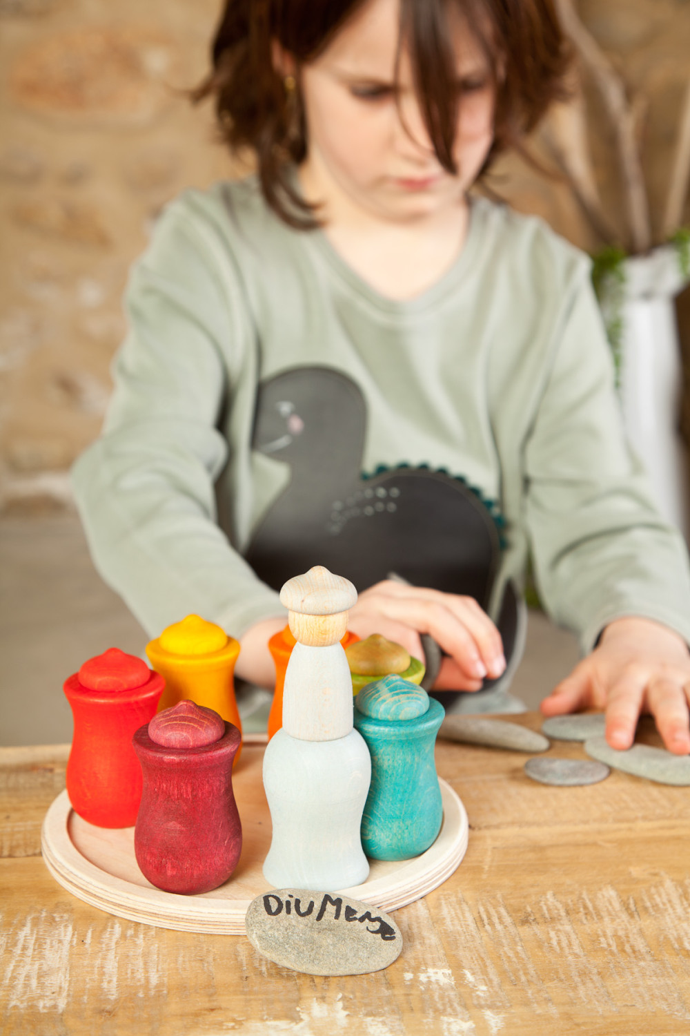 A 7 emberke és a 7 edény különböző színűek és alkalmasak a Waldorf pedagógia szerint a napok megkülönböztetésésre. A gyerekek minden napot a színükkel társítanak, és így képesek lesznek megérteni a napok múlását.