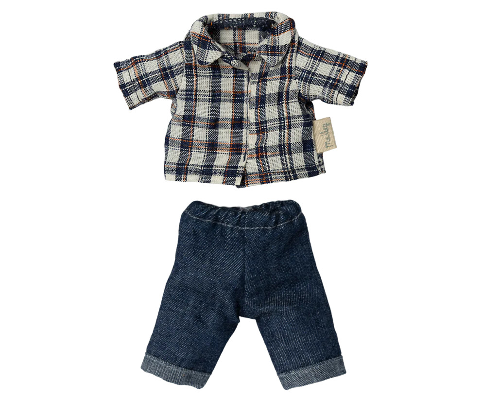Ruhakészlet egy egérnek anya/papa méretben. Ez a készlet egy inget és egy farmert tartalmaz.