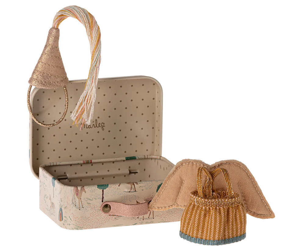 Öltöztesd fel kistestvéR egeredet ebbe a szép tündérruhakészletbe. A készlet egy szoknyát, szárnyakat és kalapot tartalmaz – mindezt egy kis fém bőröndbe csomagolva, így könnyen magával viheti útközben.