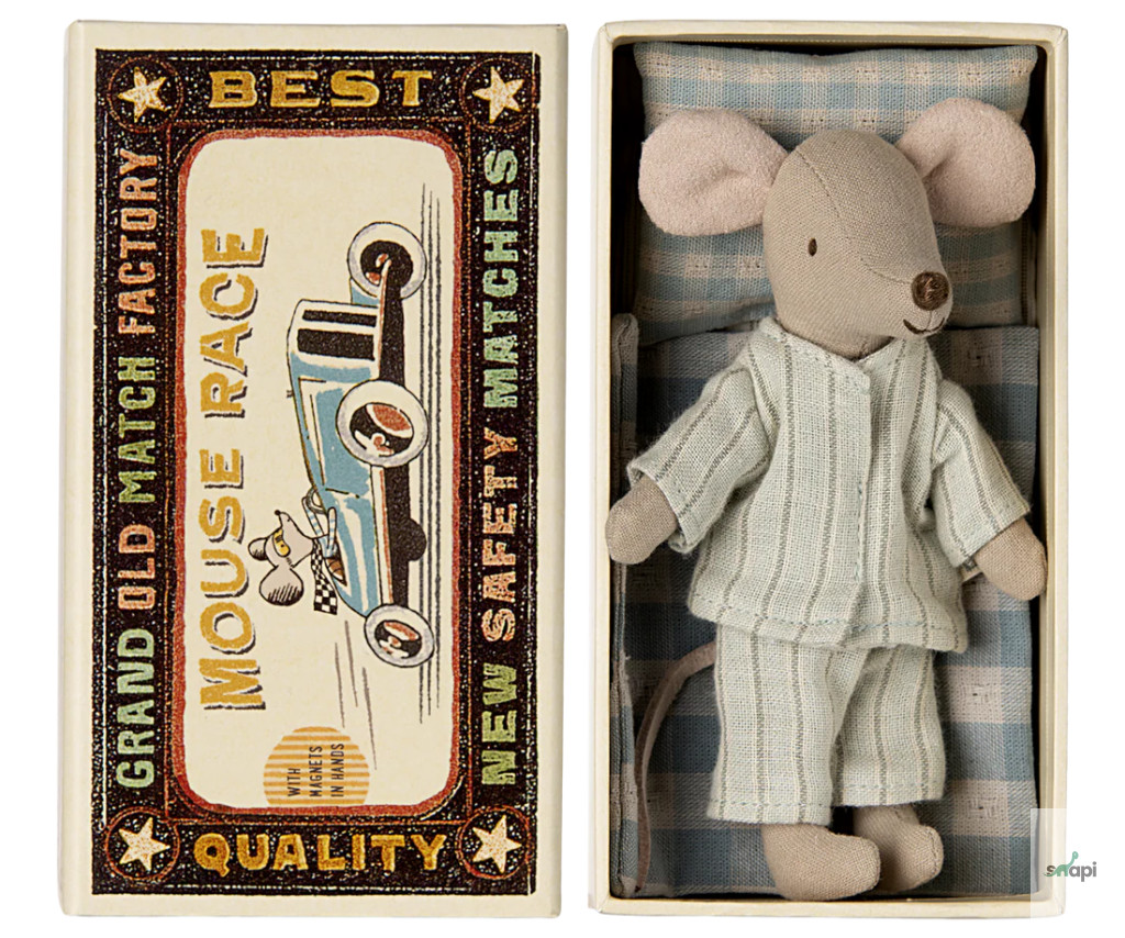 Egy klasszikus Maileg termék, ez az egér órákig tartó játékra kész, és nyugodtan alszik a kis gyufásdobozában. A ruhák és az ágynemű puha anyagokból készültek, egyedi mintákkal gyönyörű színekben. Az egér kezében mágnesek vannak.