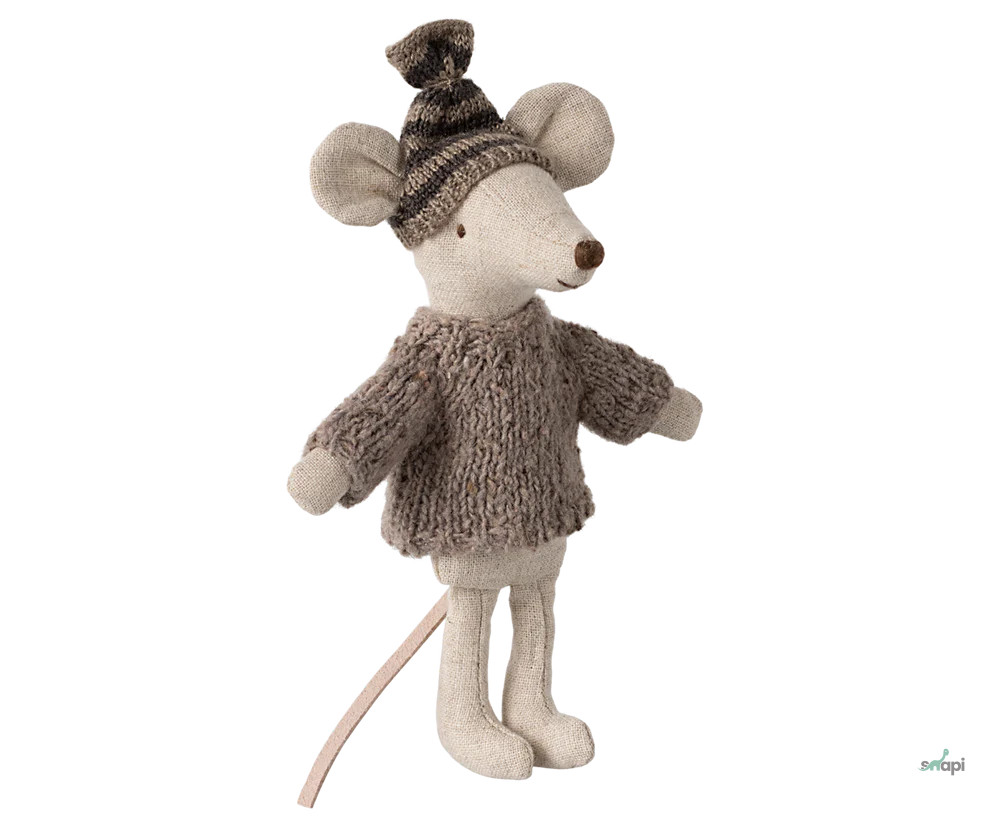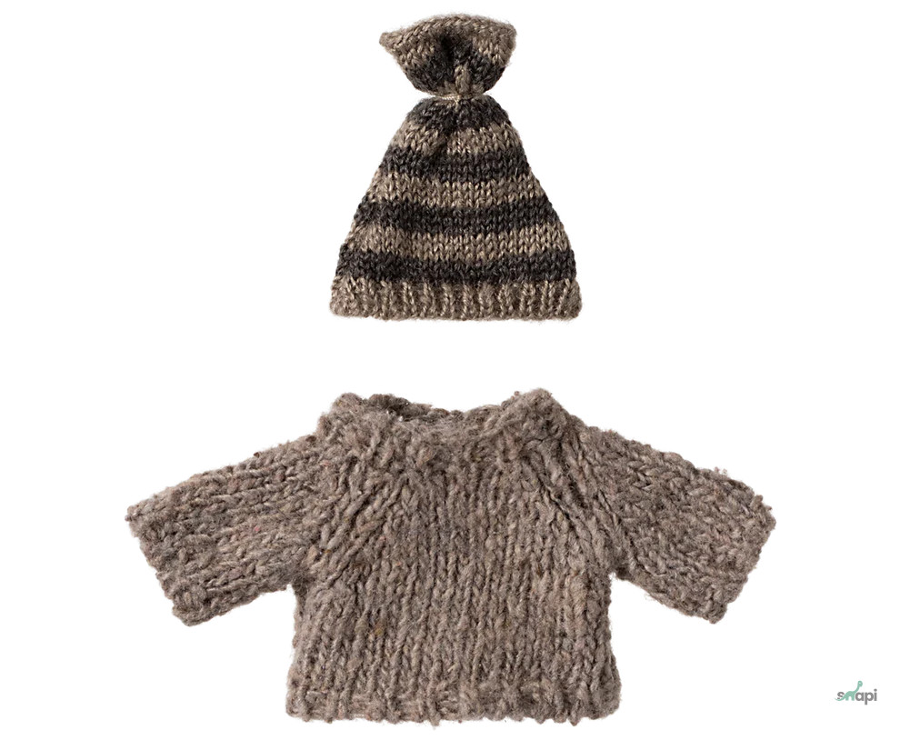 Puha kötött pulóver és sapka a hideg téli időszakra. Garantáltan melegen tartja a kis barátait. A szett a Big sister/Big brother méretű egereknek felel meg.
