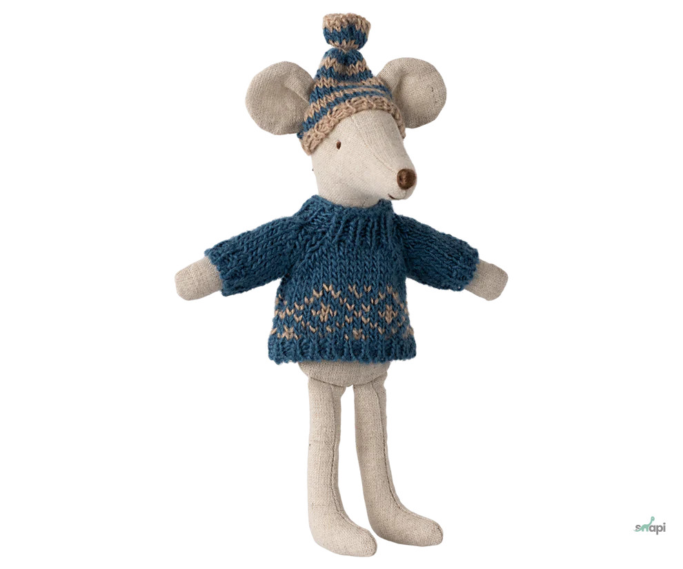 Egy puha kötött pulóver a hideg téli időszakra. Gyönyörű mintázata a skandináv kötés régi hagyományaiból inspirálódott. Az apró sapka melegen tartja a füleket. Ez a pulóver tökéletesen illik anyuka/apa és nagymama/nagypapa méretű egerekre.