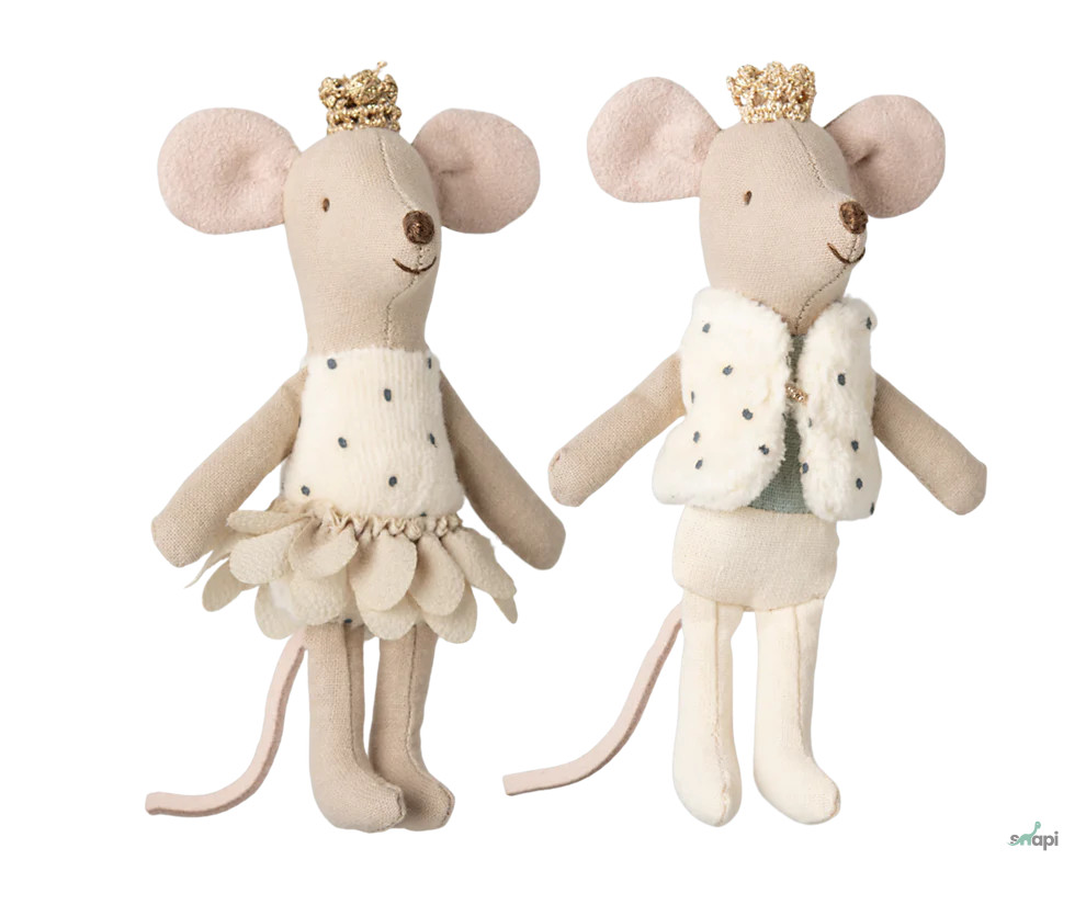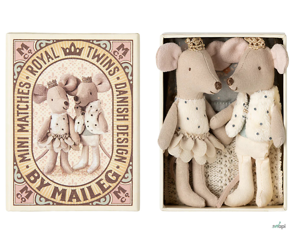 A királyi iker egerek egy kis hercegnőből és hercegből álló készlet. Arany koronát és gyönyörű ruhát viselnek. Egy gyönyörűen feldíszített gyufásdobozban alszanak, elöl egy képpel. A dobozban megtalálod a legpuhább ágyneműket.A szoknya és a mellény levehető.