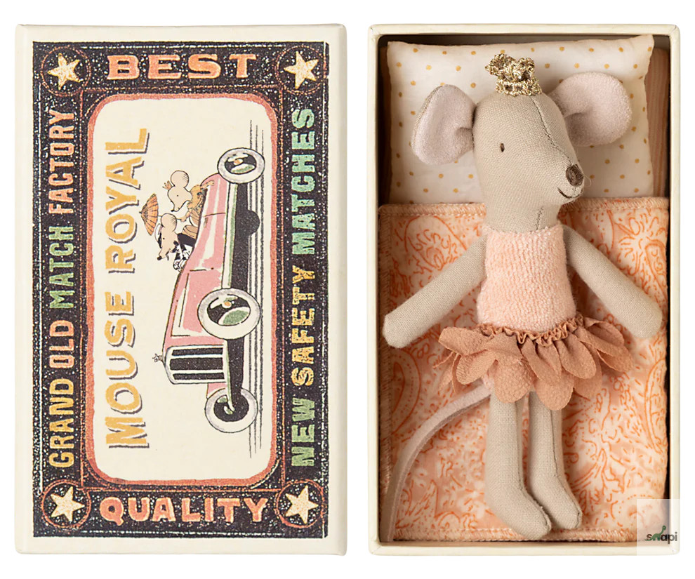 Klasszikus Maileg termék. Ez az egér készen áll az órákig tartó játékra, és egy kis gyufásdobozban alszik. A ruhák és ágyneműk egyedi mintákkal és gyönyörű színekkel készülnek. Az ágynemű színe eltérő lehet.