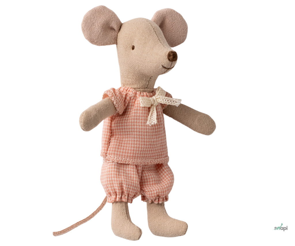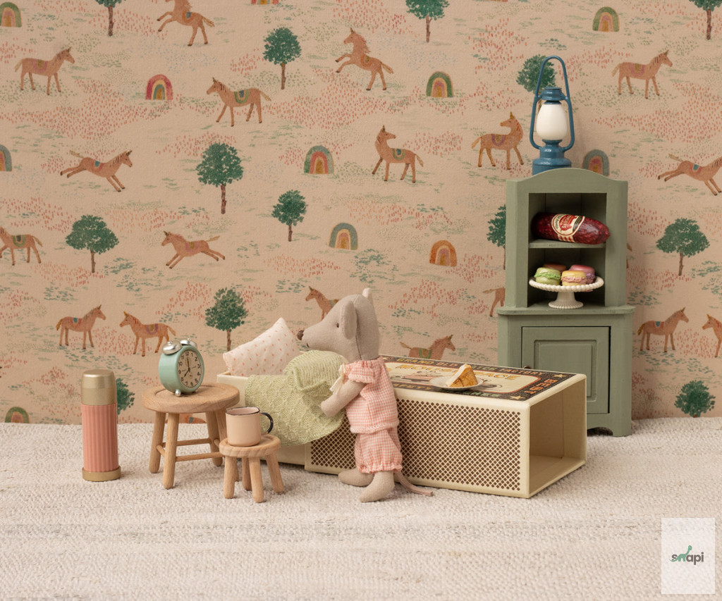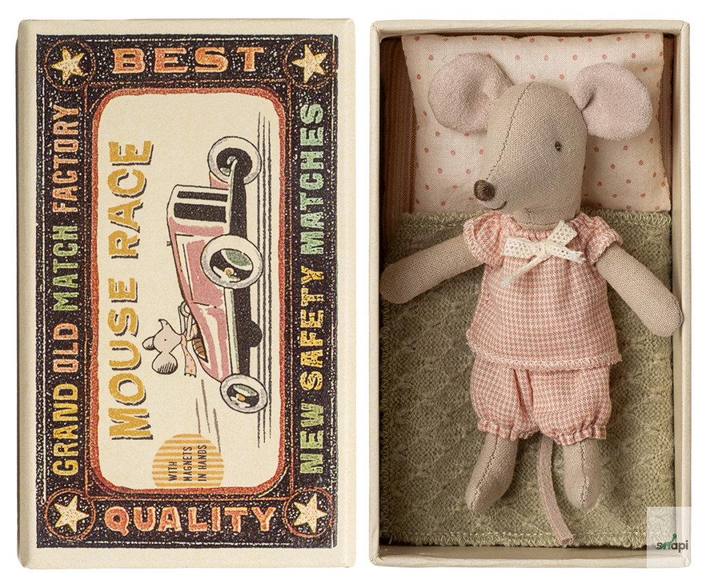 Egy klasszikus Maileg termék, ez az egér órákig tartó játékra kész, és nyugodtan alszik a kis gyufásdobozában. A ruhák és az ágynemű puha anyagokból készültek, egyedi mintákkal gyönyörű színekben. Az egér kezében mágnesek vannak.