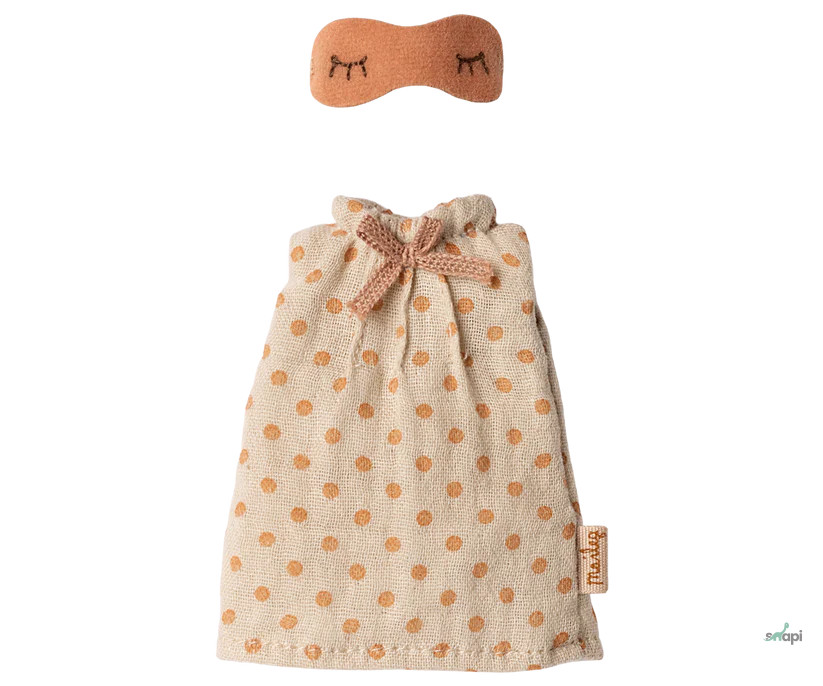 Egy puha hálóing és egy fényt nem beszűrő szemmaszk biztosítja a pihentető alvást. Ez a szett tökéletesen illik egér méretű anyukának és apukának.
