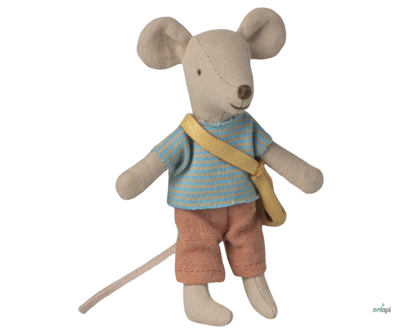 Laza ruhakészlet kistestvér egér méretű egérkéknek. Ez a szett tartalmaz egy nadrágot, egy kötött inget és egy sajtos oldaltáskát.