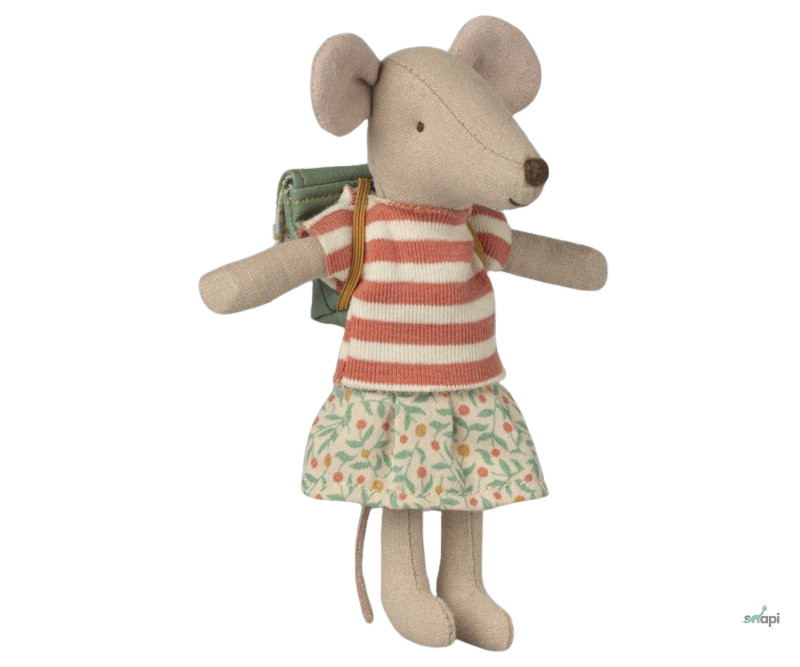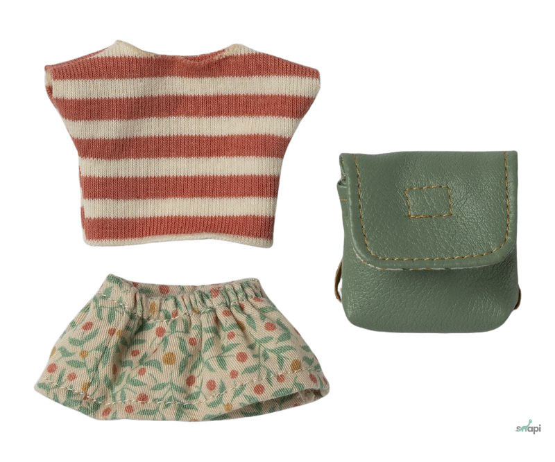 Laza ruhakészlet nagytestvér egér méretű egérkéknek. Ez a szett tartalmaz egy szoknyát, egy pólót és egy hátizsákot.