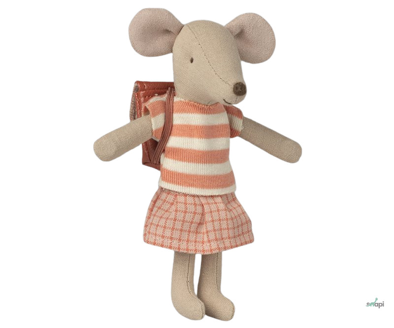 A nagyobbik egér készen áll az iskolai napra, a hátán cipeli a hátizsákját. Mágnesek vannak a kezében, így meg tudja fogni a tricikli fogantyúit egy gyors utazáshoz.
