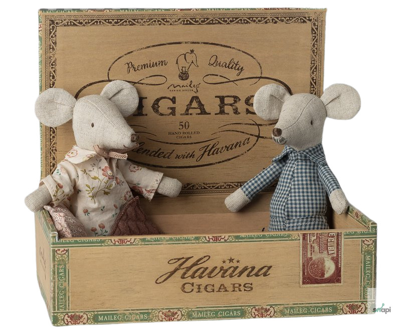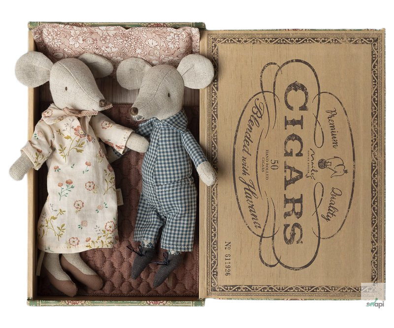 Klasszikus Maileg egerek. A nagymama és a nagypapa hálóruhában és gyönyörű cipőkben vannak. A szivarosdoboz tökéletes ágy a pihentető alváshoz. Bővítsd a ruhatárukat laza ruhadarabokkal, hogy tökéletes játékszettet alkoss.