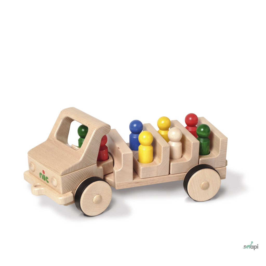 Veľký nákladný automobil na prepravu kmeňov: dlhý základný model s tromi odnímateľnými lavičkami a ôsmimi drevenými figúrkami – všetko zo série Nic Creamobil.