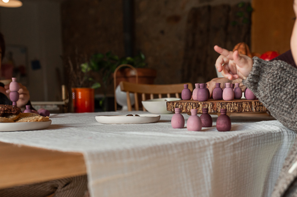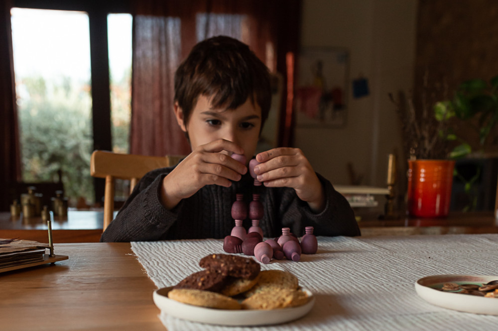egyes darabok elveszíthetik a színüket, amikor nyállal érintkeznek, de ez teljesen rendben van, mivel minden szín 100%-ban biztonságos és nem mérgező. Az elemek befejezése növényi eredetű viaszokkal és olajokkal történik. Az olajok eleinte erős aromájúak lehetnek, de idővel megpuhulnak. Csomagolásuk teljesen műanyagmentes.