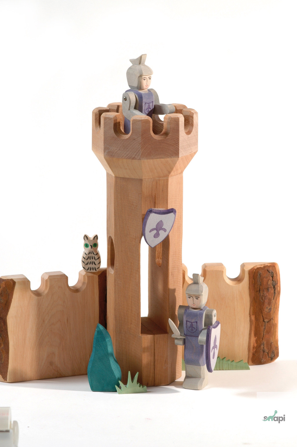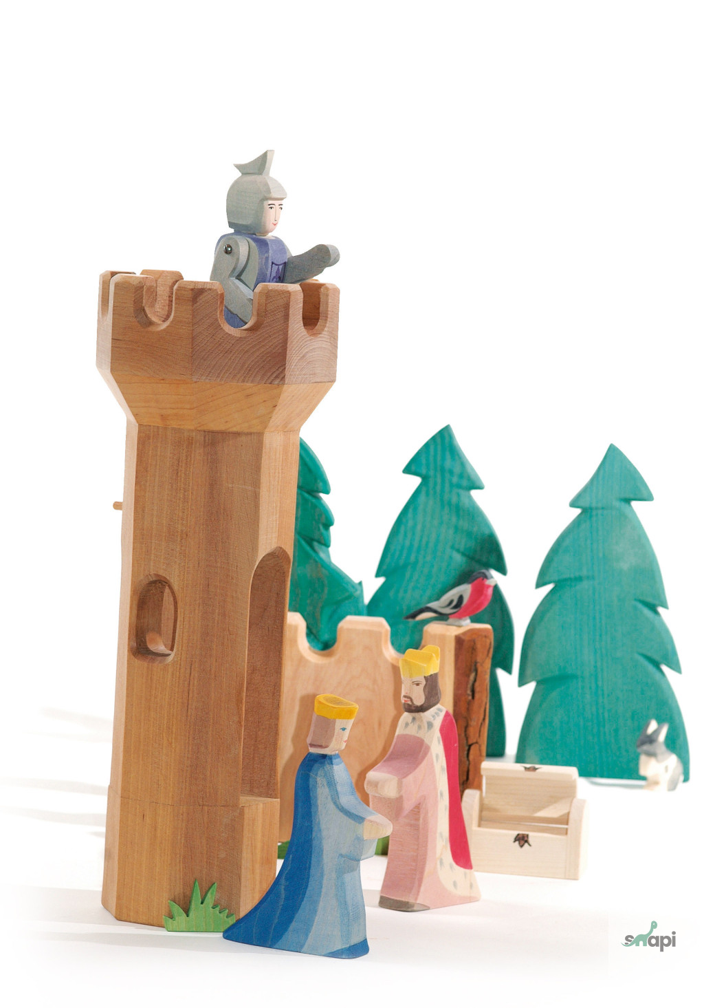 Égerfából készült kerek torony a nagy Ostheimeri mesebeli kastély kapujához. Kiváló minőségű fajátékok, amelyek erősítik a gyerekek képzelőerejét.