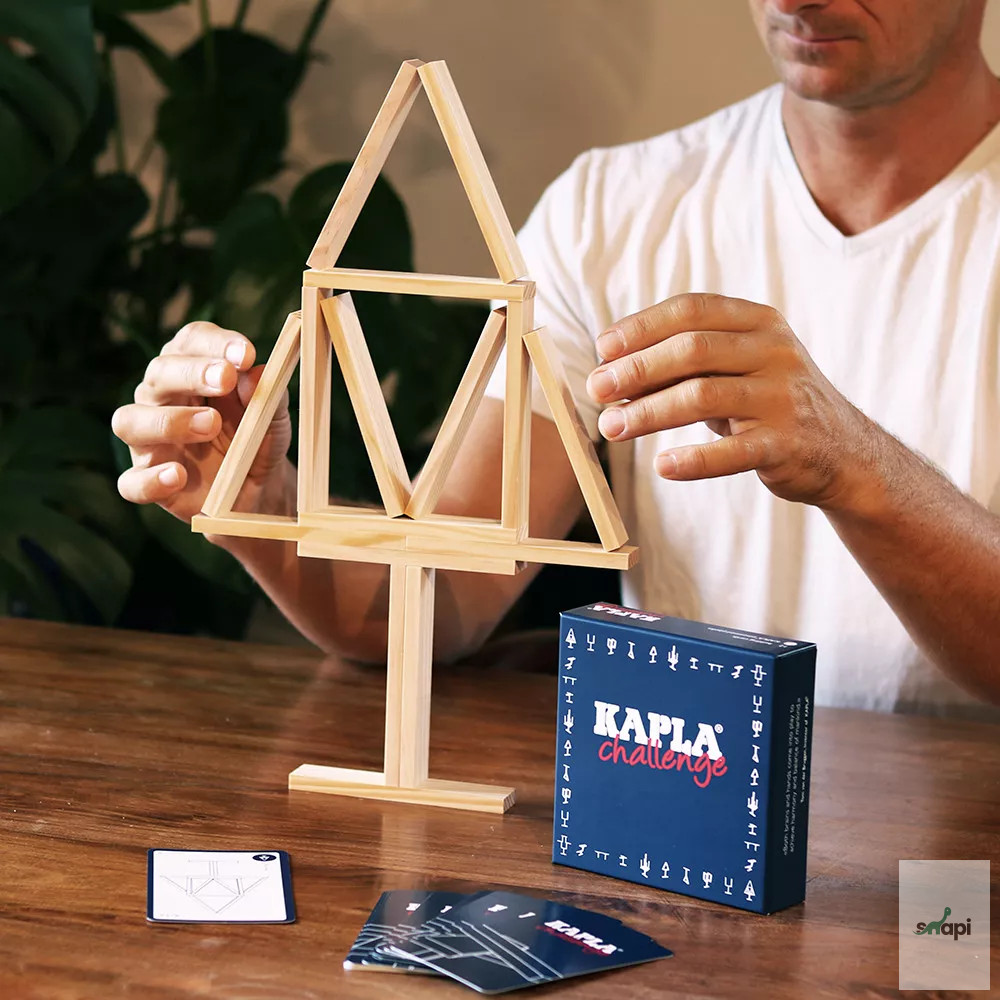 A KAPLA ® Challenge egy új játék a KAPLA ® kínálatában. Koncentráció és kitartás szükséges a tökéletes egyensúly eléréséhez. Ahogy végigjátszod a kártyákat, a szerkezetek egyre bonyolultabbá válnak. Logikát és kreativitást kell használnod, hogy megtaláld a módját, hogyan tarthatod egyensúlyban a kihívást!