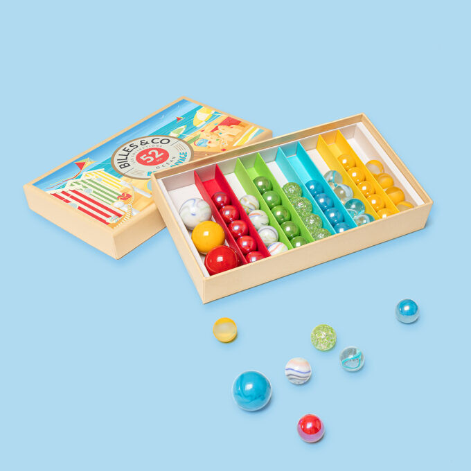 Fedezd fel újra az üveggolyók varázsát! Az üveggolyók igazi kincsekké vállnak: csodálható, játszható és gyűjthető darabok, melyek a francia Billes & CO által tematikus és színes összeállításokba, játékos és kreatív univerzumokba rendeződnek.