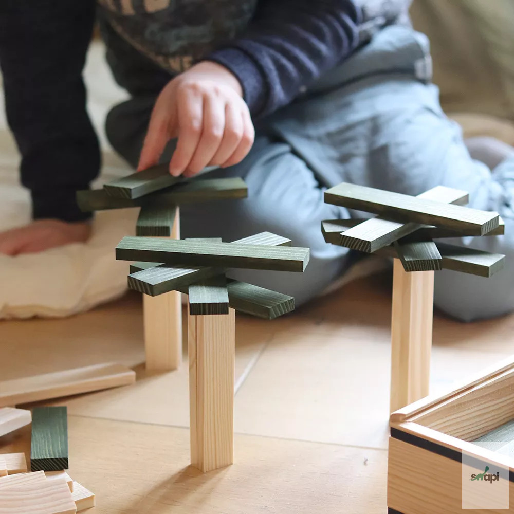 A KAPLA pallók 100%-ban megújuló francia erdőkből származnak, természetes landesi fenyőből készülnek. A színes pallókat élelmiszerbiztonságos festékkel festik.