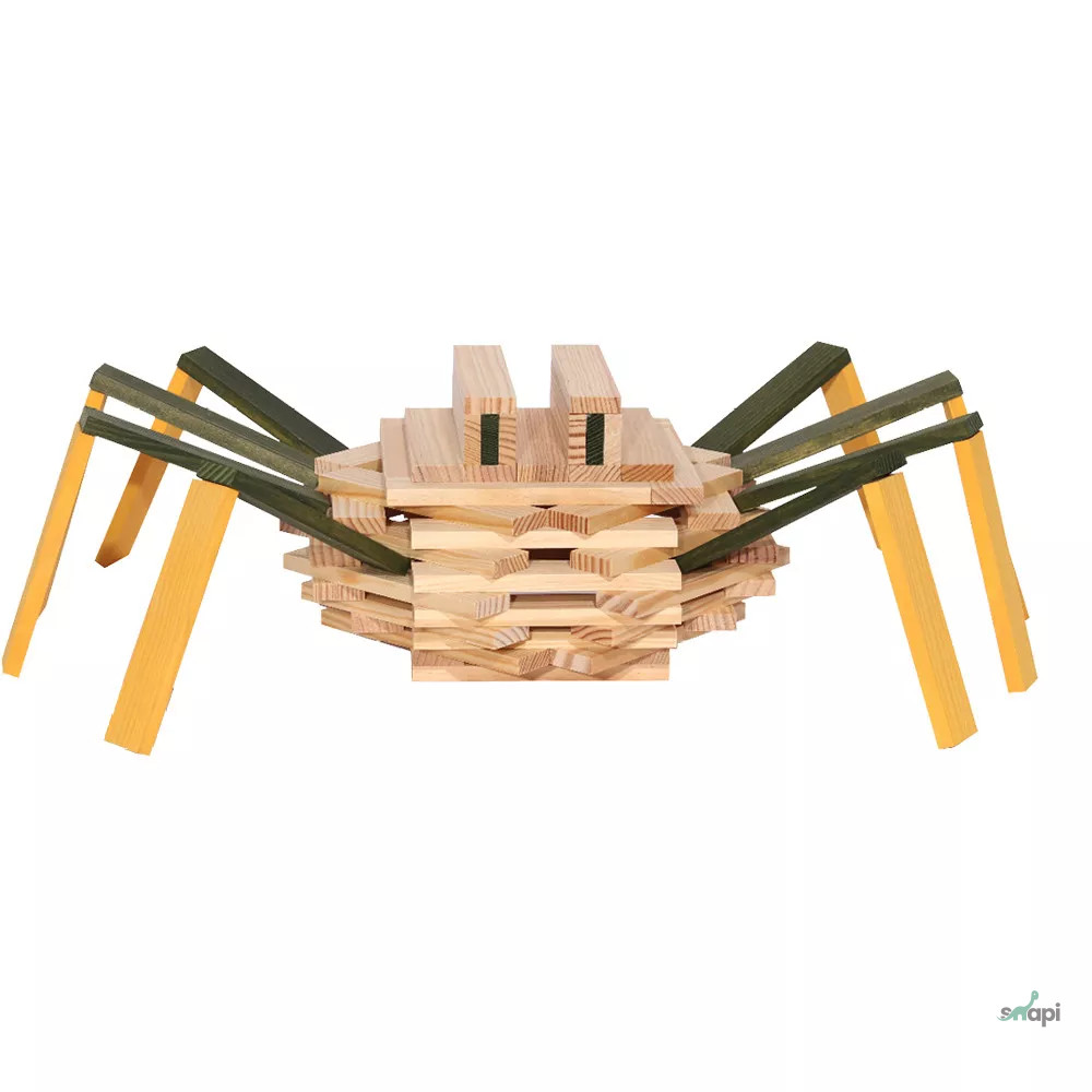 A faláda 75 natúr és színes deszkát tartalmaz (55 natúr, 10 sárga és 10 zöld). A tolófedél hátulján részletes lépések találhatók, amelyek végigvezetik a 4 éves kortól az építőket saját imádnivaló pókjuk megalkotásán.