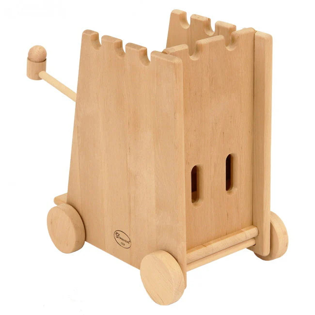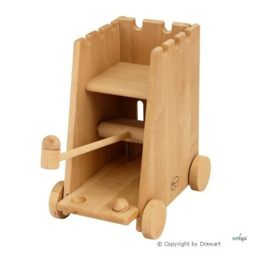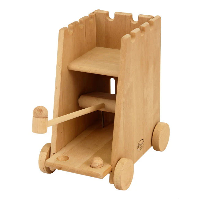 Tento krásny a veľký Drewart katapult nie je len najvyššej kvality a okamžite priťahuje deti, ale naozaj funguje. Je doplnený dvoma "kameňmi" (drevenými guľôčkami), ktoré ležia v malých priehlbinách, kým sa nepoužijú. Dieťa môže stiahnuť katapultovú páku a pustiť ju, čím vystrelí cez miestnosť.