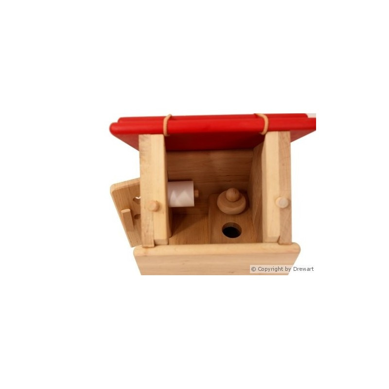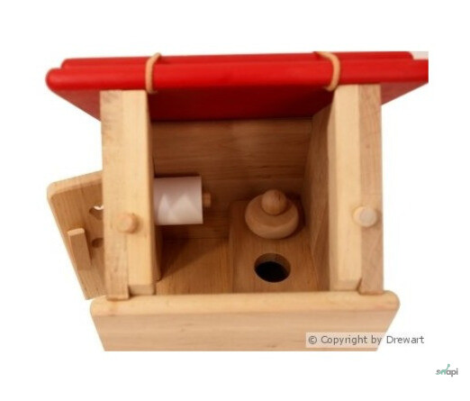 A Drewart toilet épülete egy nyitható ajtóval és egy levehető tetővel rendelkezik, amely megkönnyíti a benti játékot. A melléképületben van egy kis wc pad és egy tekercs wc papír.
