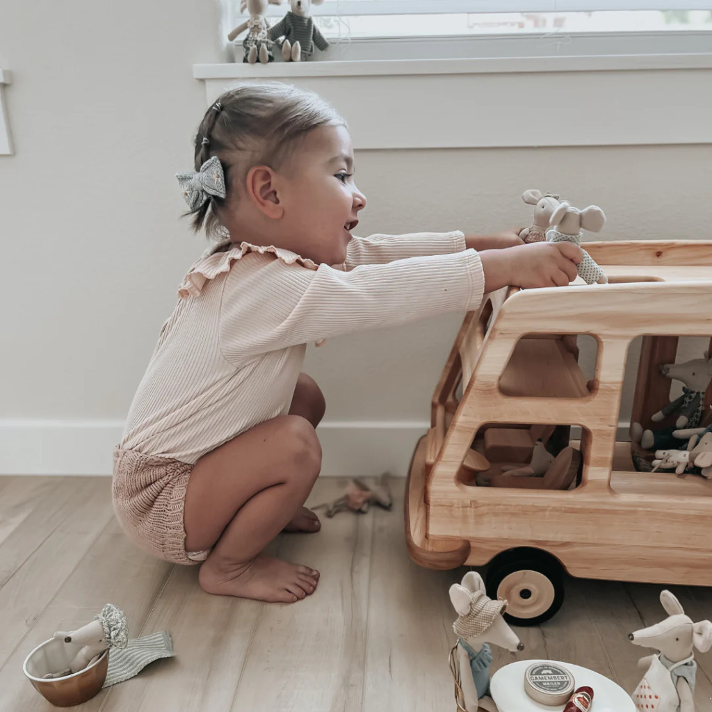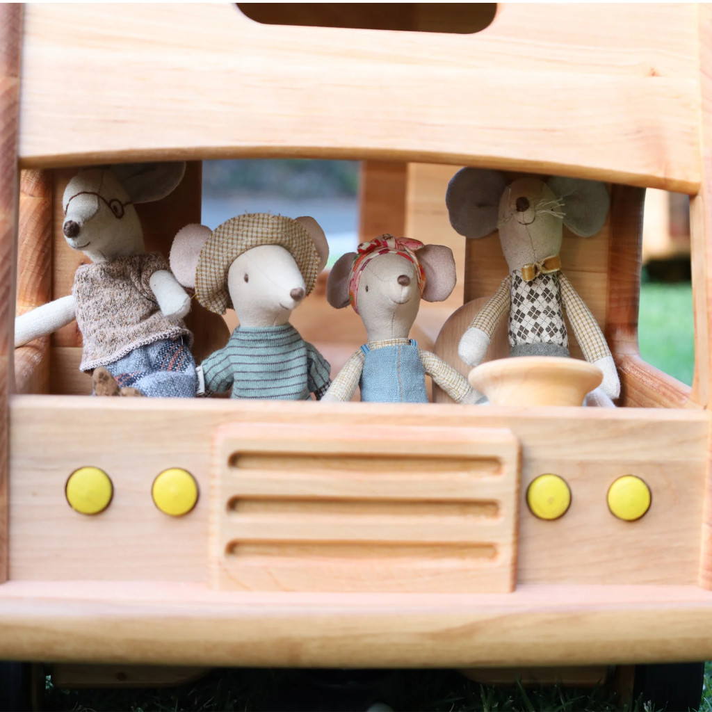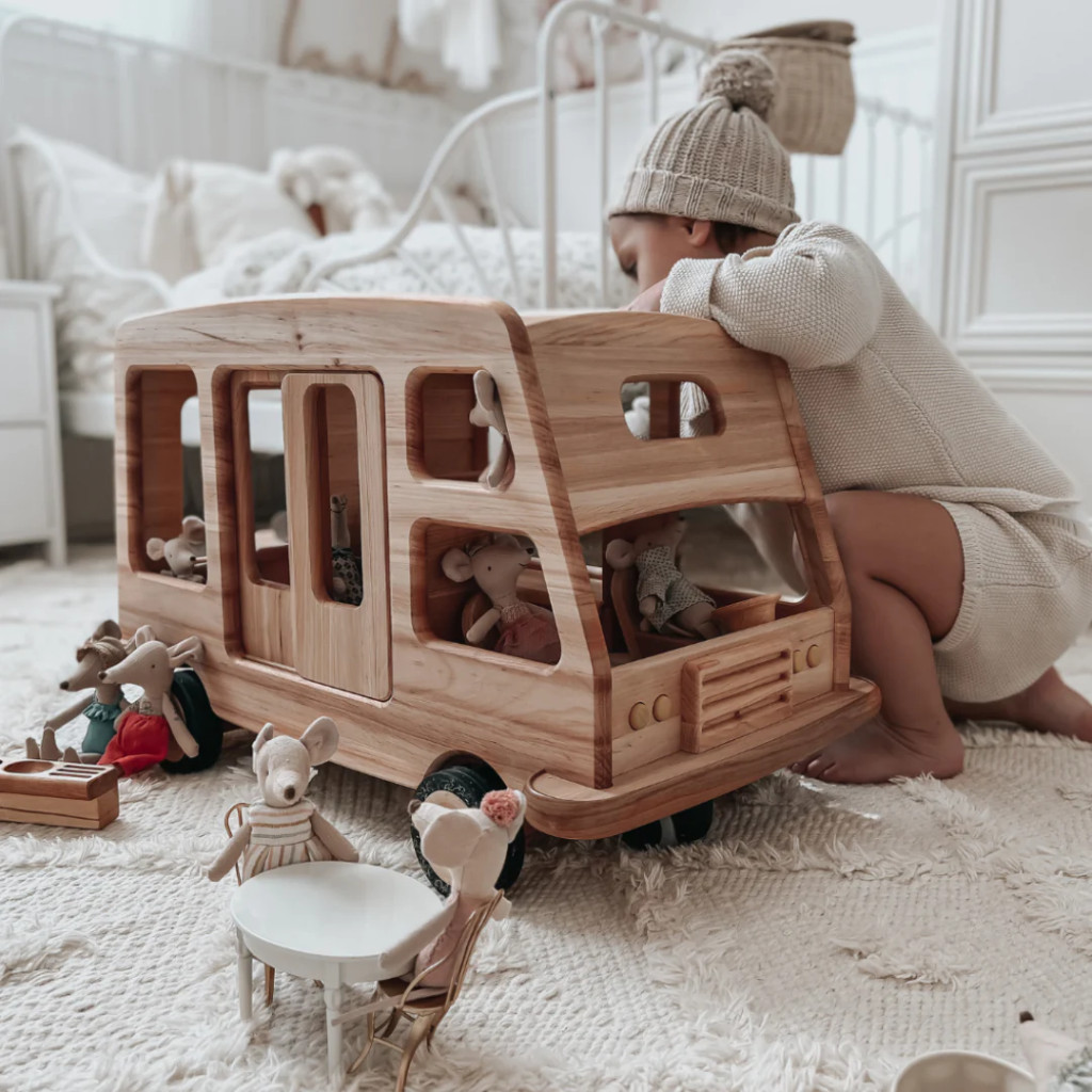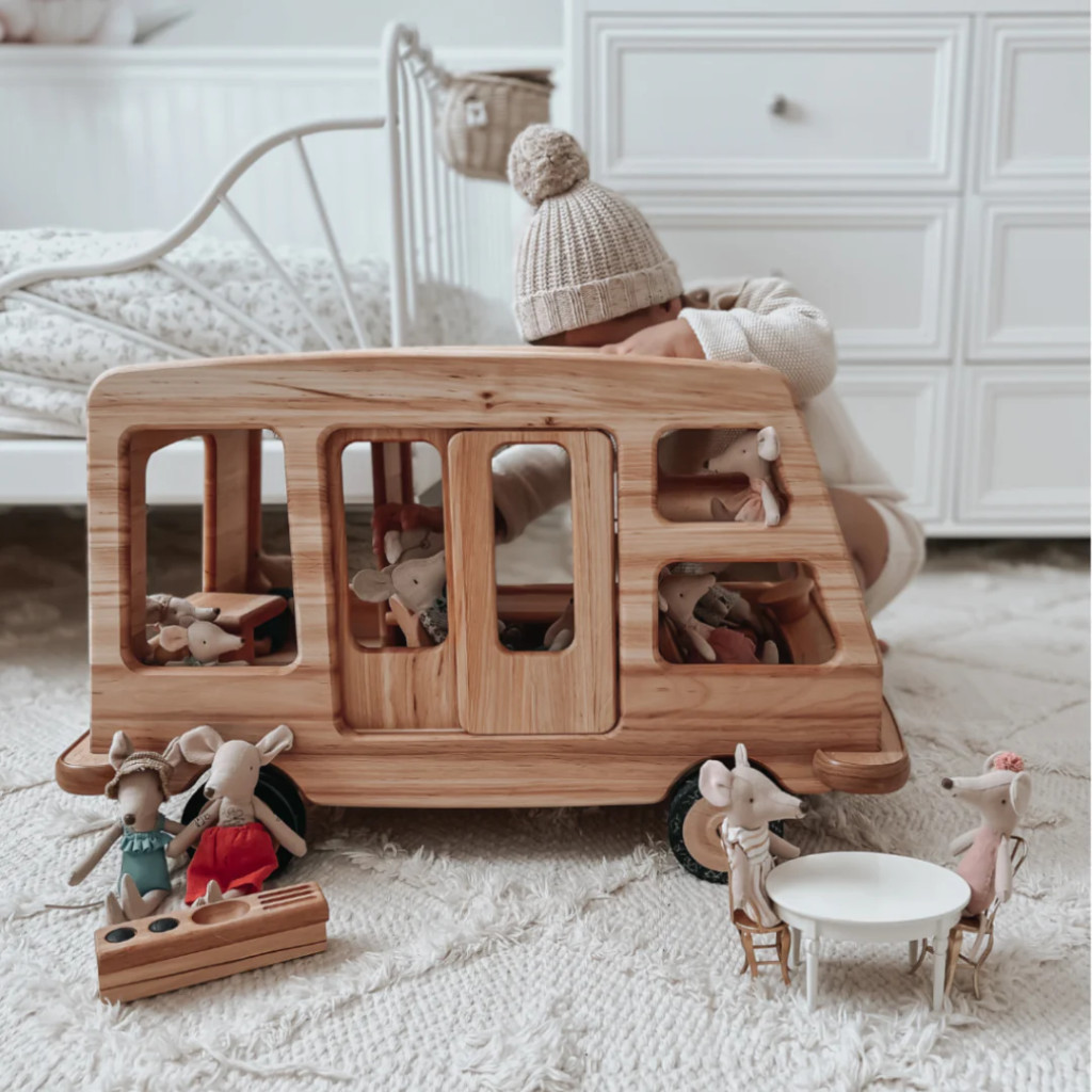 Fenntartható európai égerfából készült. ez az örökségminőségű lakóautó kényelmesen elfér gyermeke babája vagy Maileg kollekciójában, és órákon át inspirálja a fantáziadús játékot. A lakóautó kormányozható, fix kabinülésekkel, valamint a furgonon belül és kívül áthelyezhető bútorokkal érkezik. A mellékelt bútor két székből, egy asztalból, egy konyhapultból mosogatóval és egy nagy fedős edényből (vagy biliből áll, a képzeletétől függően).
