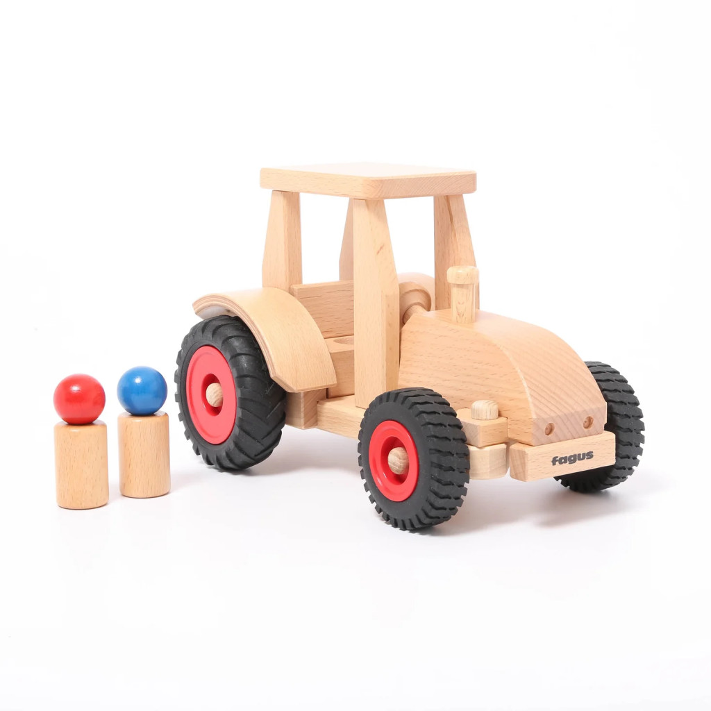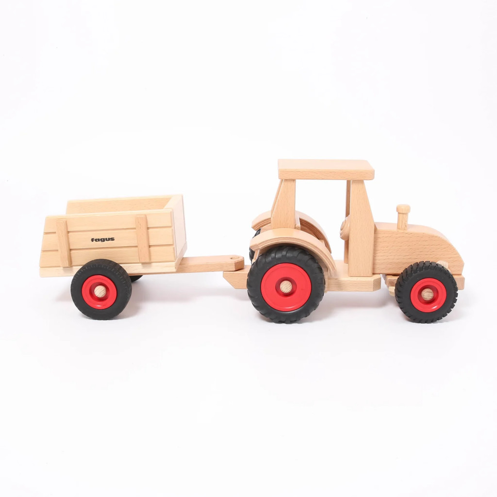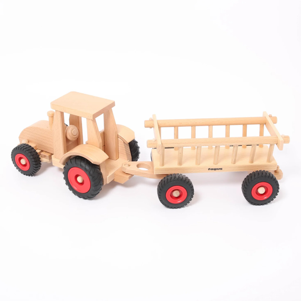 Tento játéktraktor má funkčný volant a dve drevené figúrky, vďaka čomu je ideálny pre každú hračkársku farmu. Vďaka riaditeľným predným kolesám sa ľahko otáča, či už ide o orbu alebo prepravu balíkov na farme. Príslušný vozík na seno a príves robia hru ešte kompletnějšou.