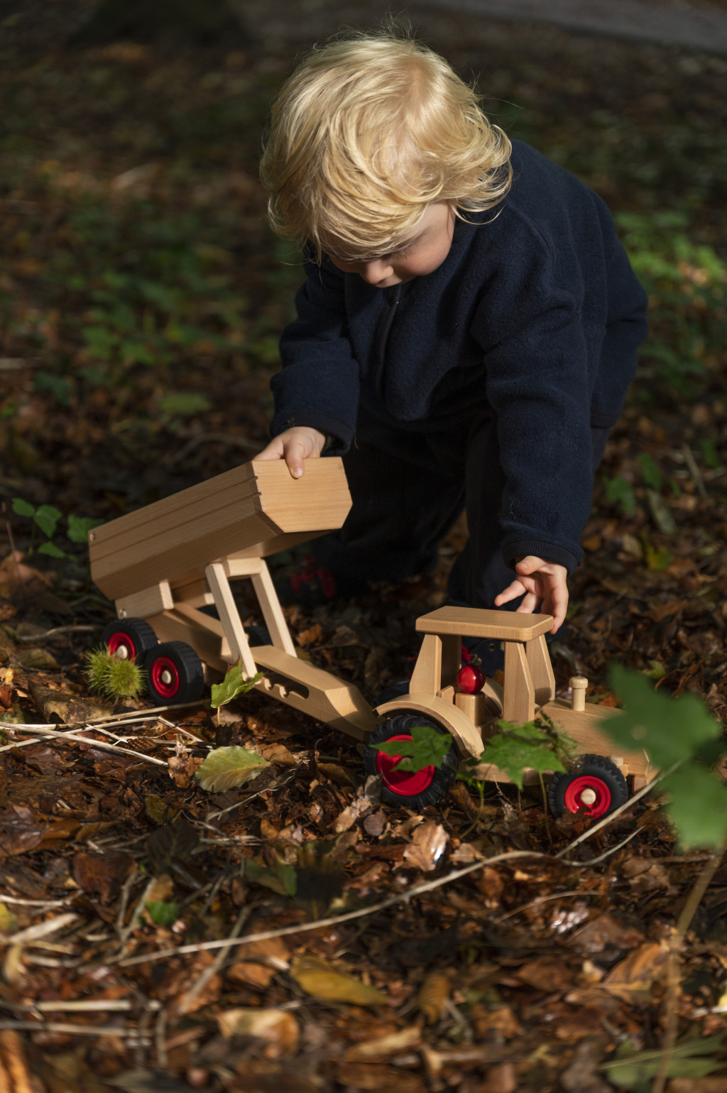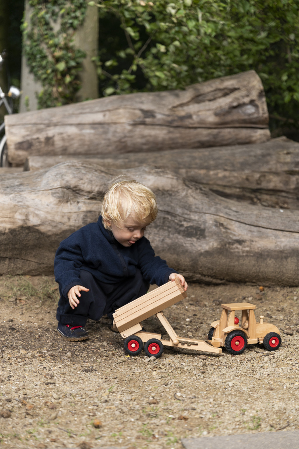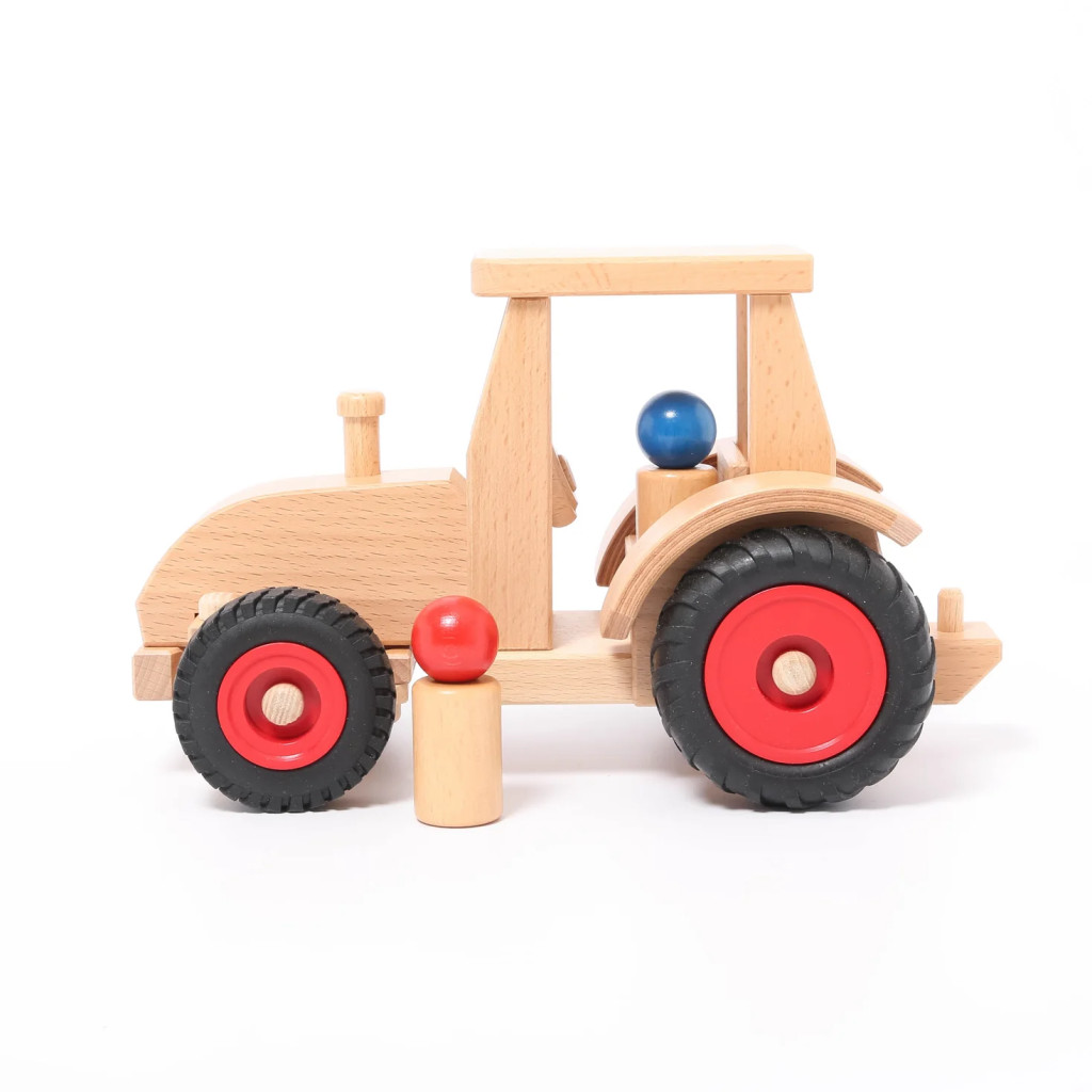 Tento játéktraktor má funkčný volant a dve drevené figúrky, vďaka čomu je ideálny pre každú hračkársku farmu. Vďaka riaditeľným predným kolesám sa ľahko otáča, či už ide o orbu alebo prepravu balíkov na farme. Príslušný vozík na seno a príves robia hru ešte kompletnějšou.