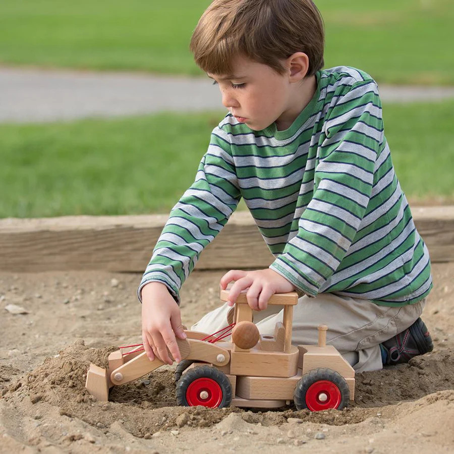 Táto hračka má funkčný volant, ovládacie prvky lyžice a 2 drevené figúrky. Uchopte kabínu, nasmerujte nakladač na miesto, potom nastavte výšku a uhol lyžice, aby ste nabrali drobnosti (orechy, plody, kamienky).