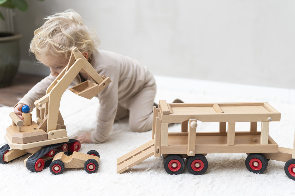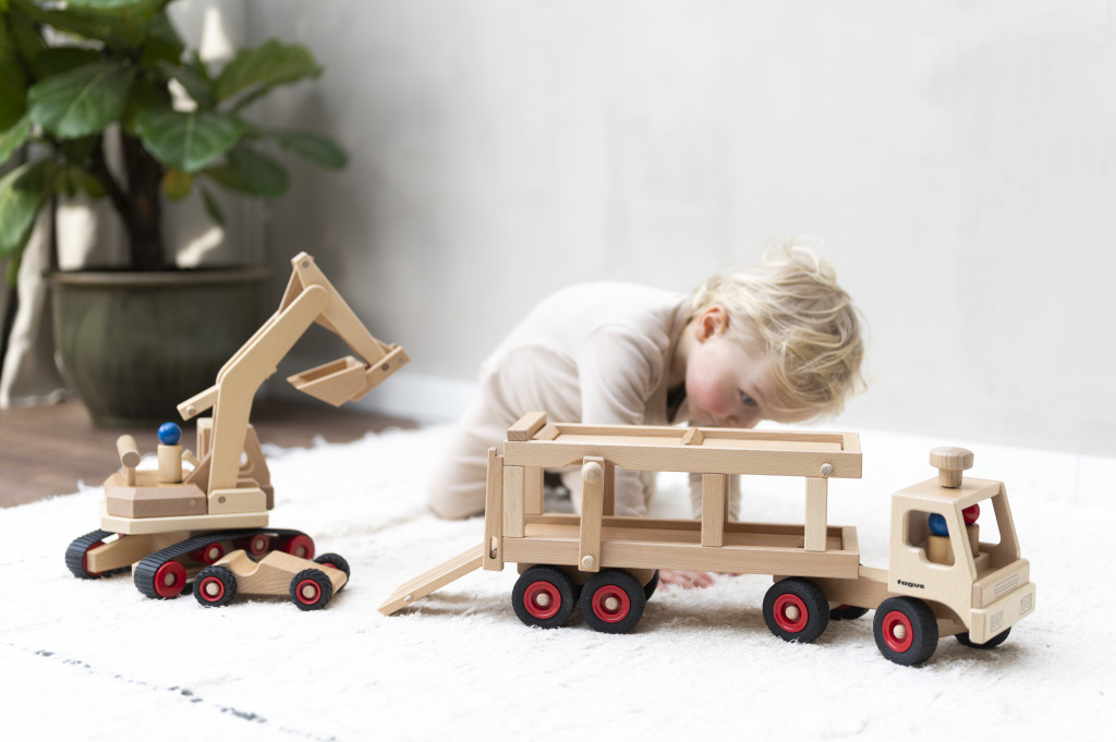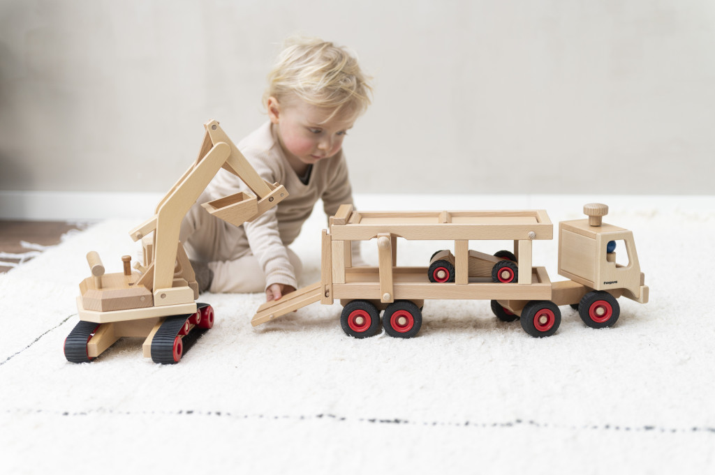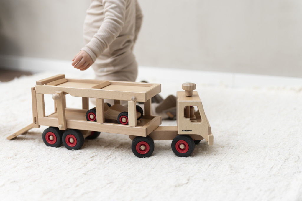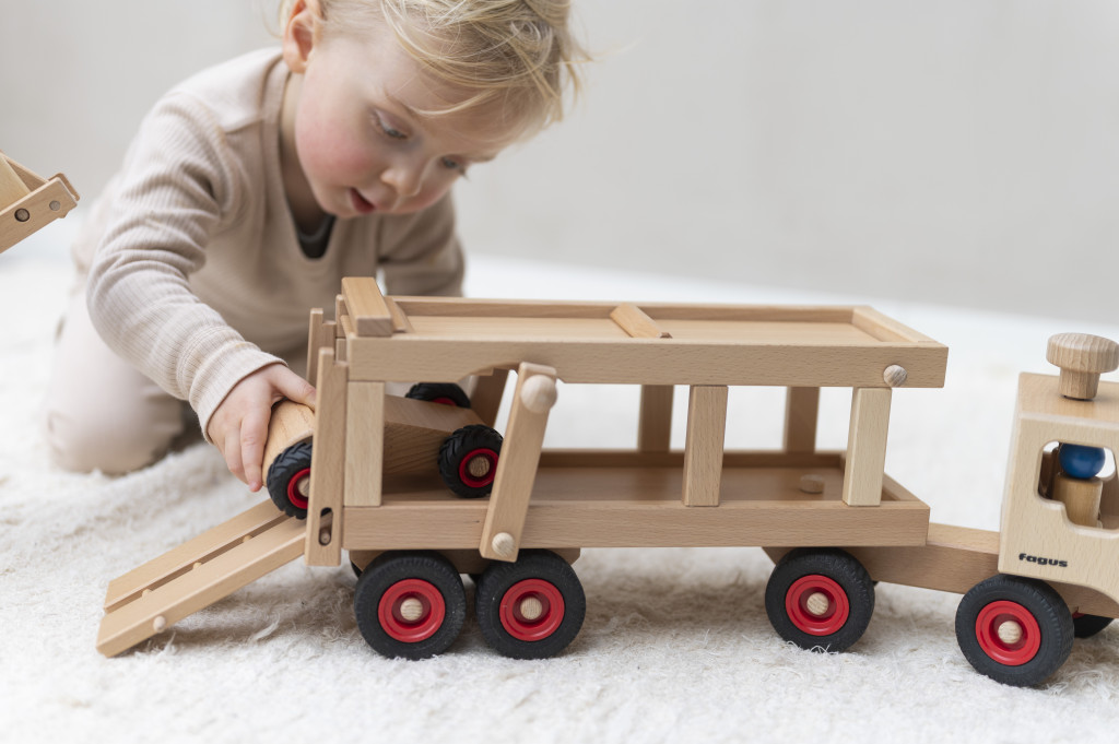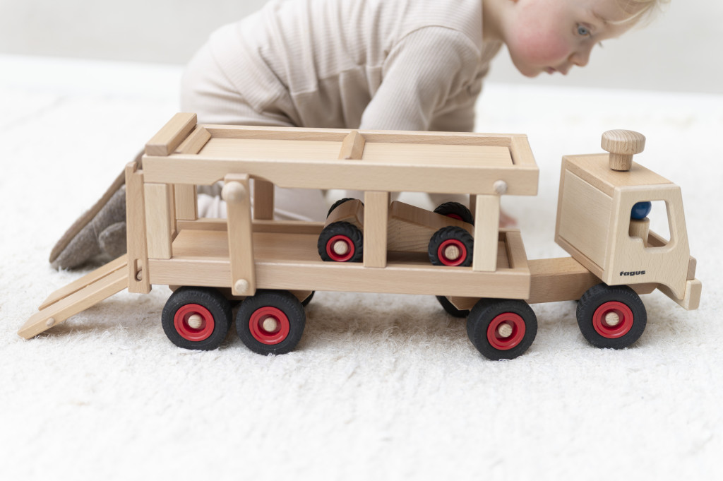 Tento veľký kamión na prepravu áut obsahuje dve drevené figúrky, športové auto a funkčnú rampu. Vďaka funkčnému volantu a sklopnej rampe je veľmi ľahké kamión držať a ovládať. Možno ho použiť samostatne alebo kombinovať s inými drevenými vozidlami Fagus.