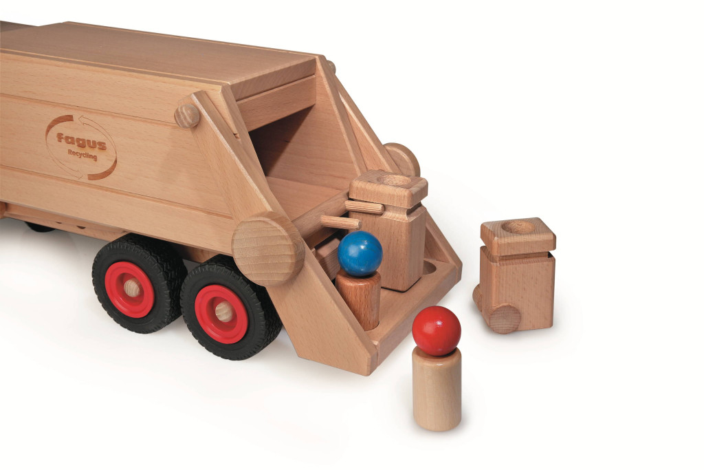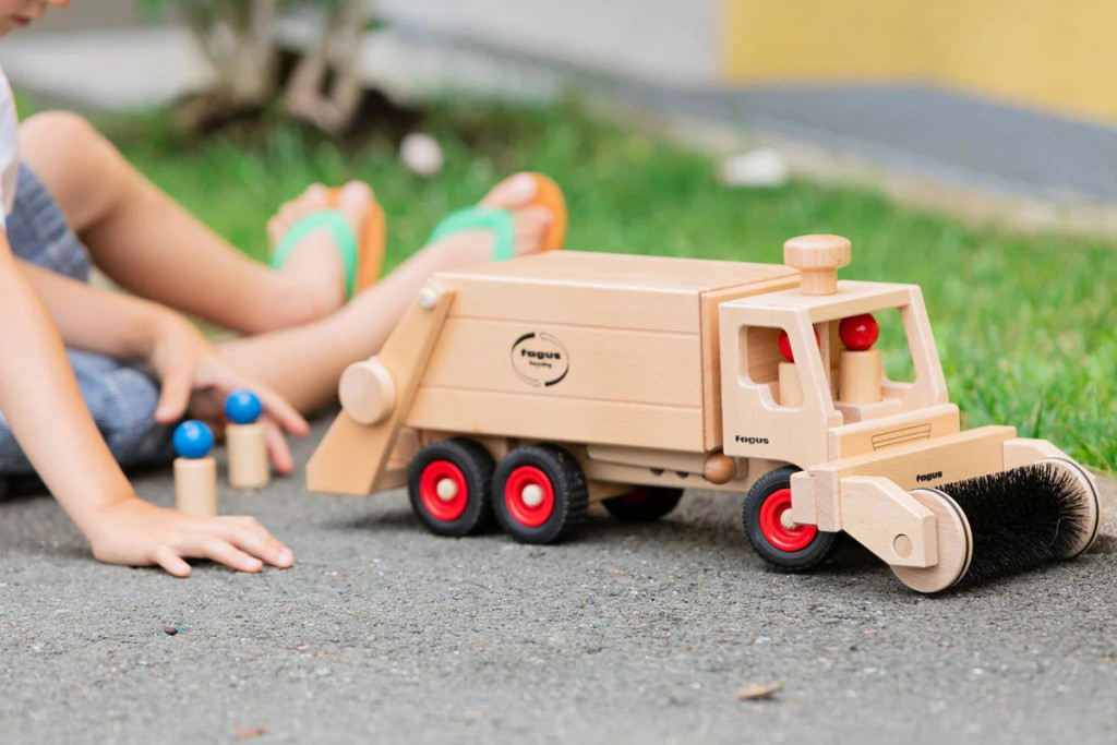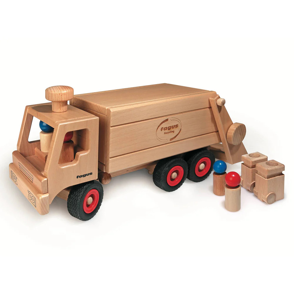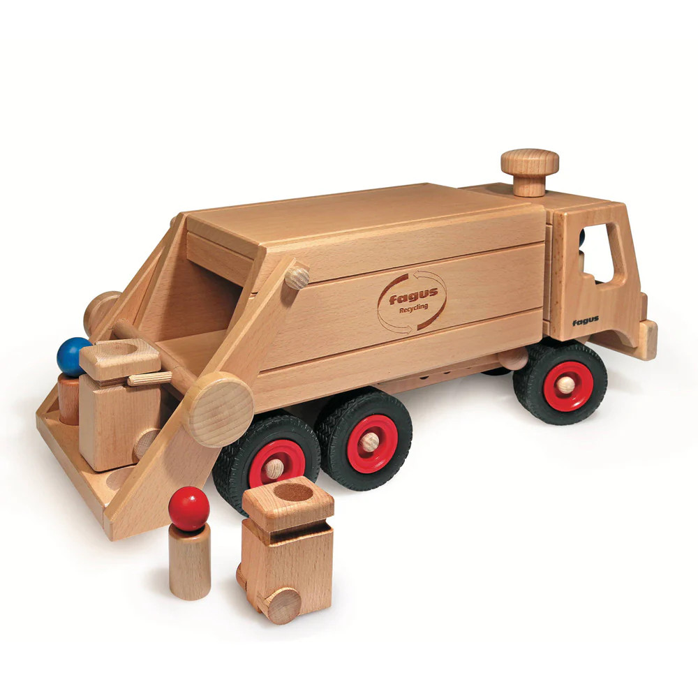 Vyrobené v Nemecku z bukového dreva z udržateľných zdrojov, toto smetiarske auto je ekologické a výborne podporuje fantáziu pri hre. Má funkčné riadenie a vzadu mechanizmus, ktorý umožňuje zavesiť smetné koše a vysypať ich do auta. Poskytuje pútavý zážitok, ideálny na rozprávanie príbehov a hranie rolí. Smetiarske auto je samo o sebe skvelá zábava, ale jednoducho sa dá kombinovať aj s inými Fagus vozidlami pre ešte vzrušujúcejšiu hru.