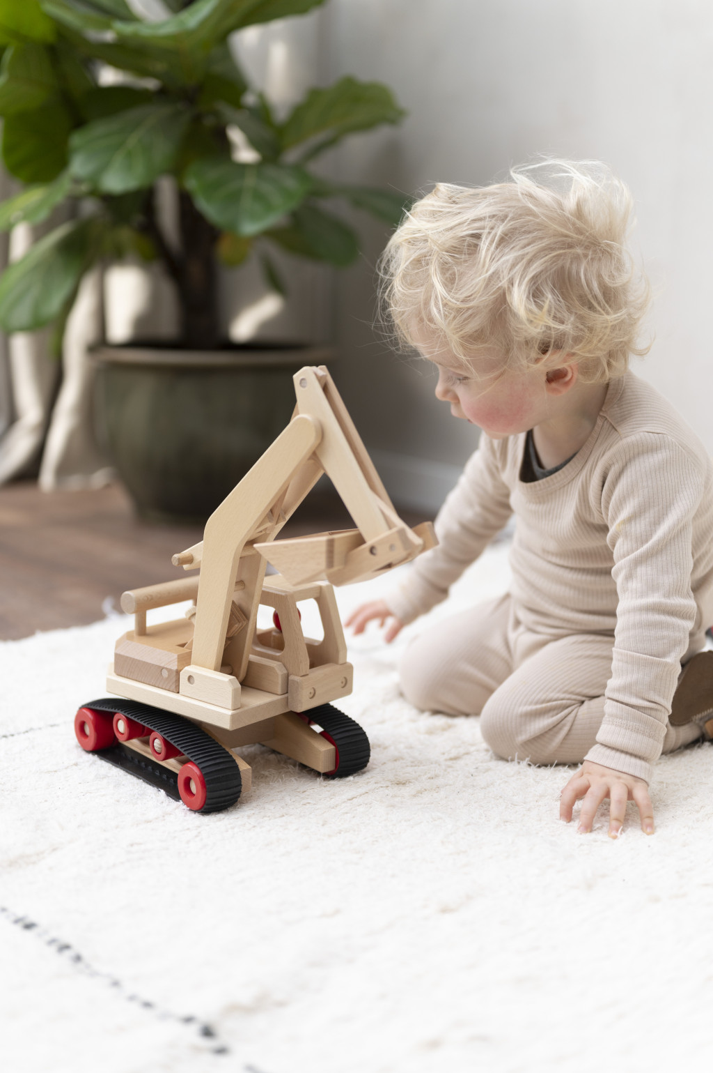 Veľký, ekologický drevený bager s prírodným povrchom a gumovými pásmi.