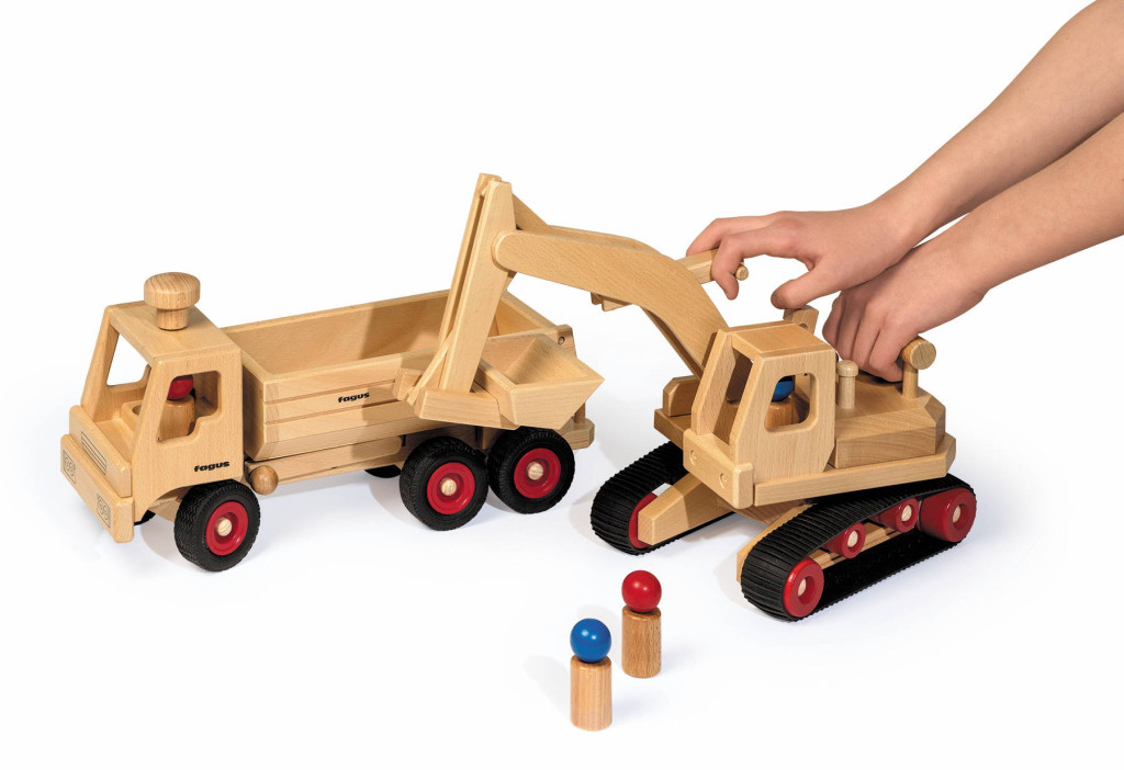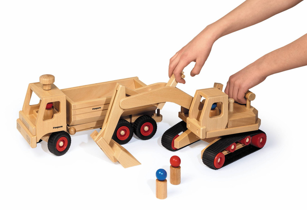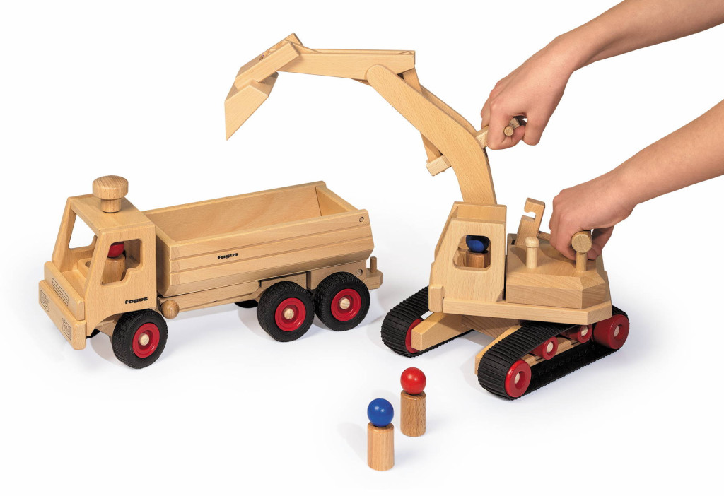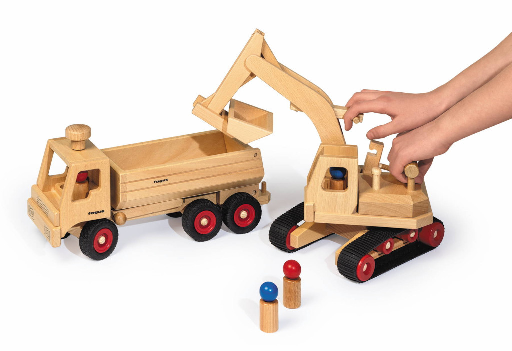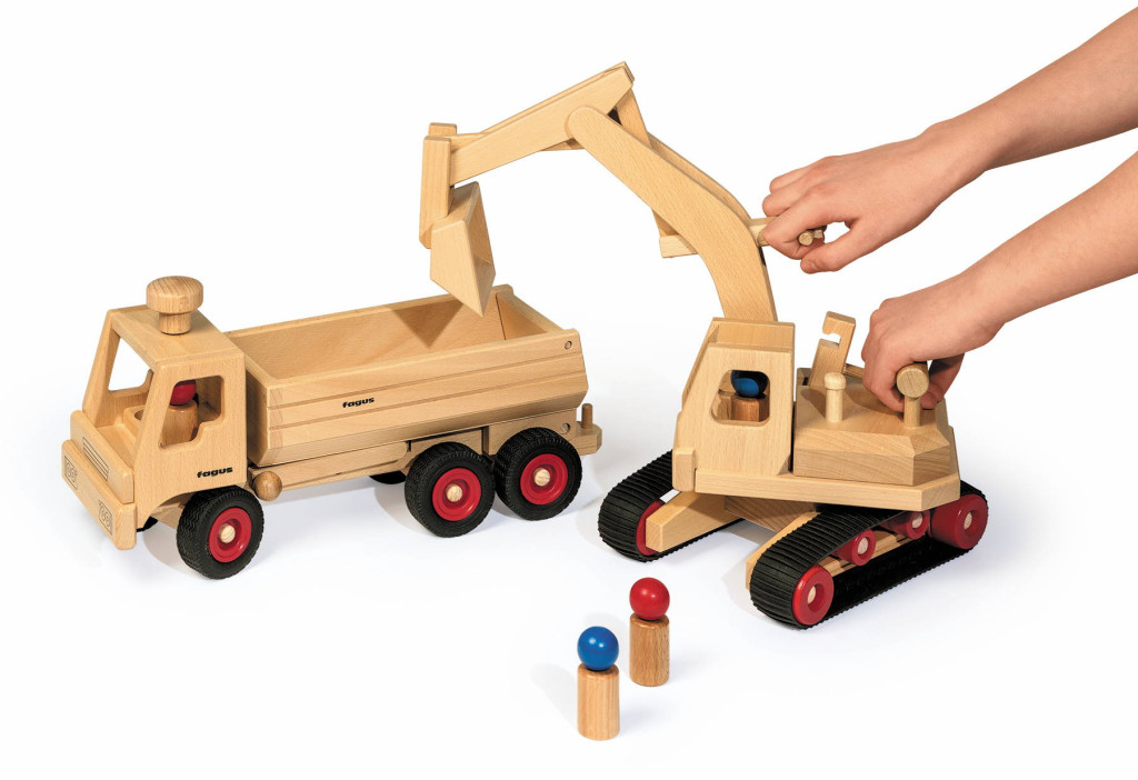 Tento bager má dve drevené figúrky a nastaviteľnú lyžicu. Perfektne sa používa samostatne, ale ľahko sa kombinuje aj s inými drevenými vozidlami Fagus.
