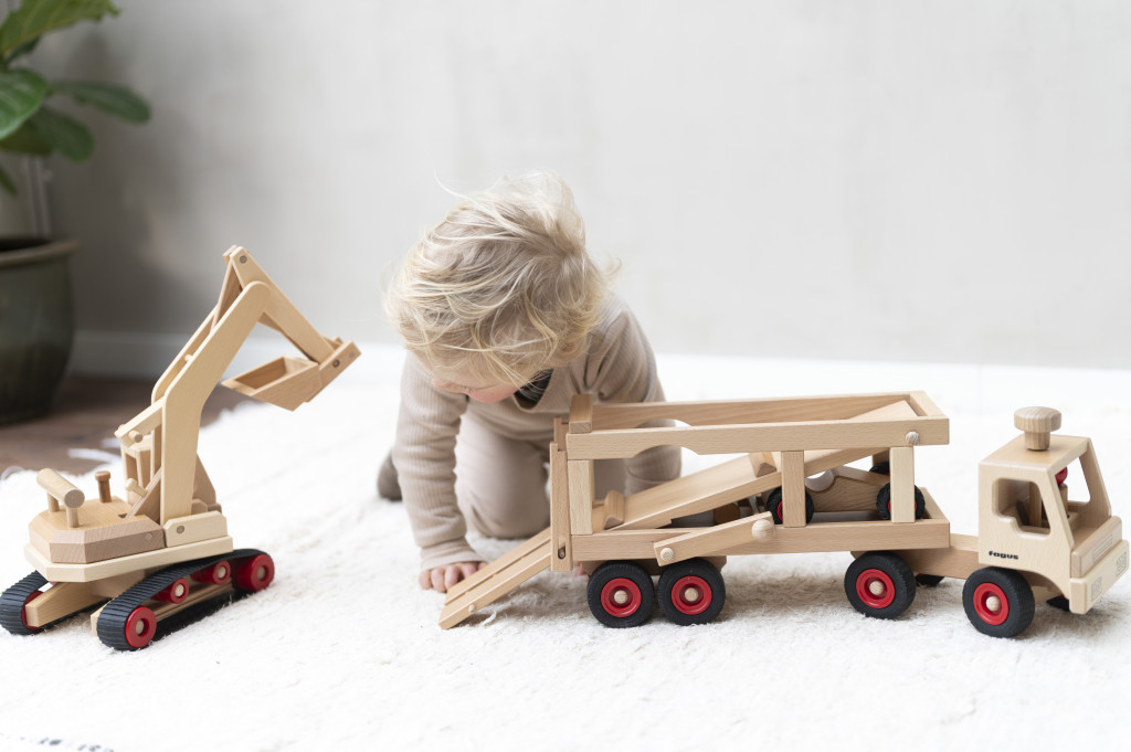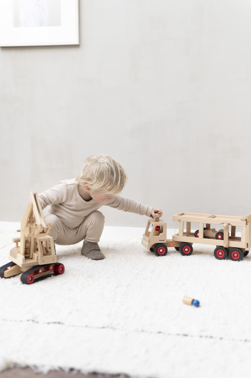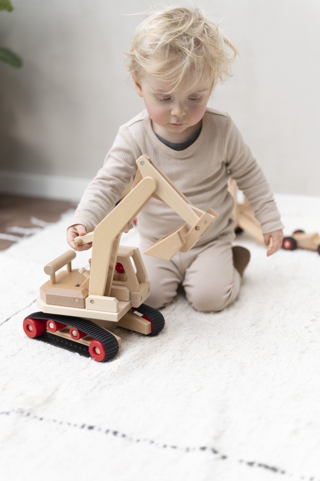 Tento bager má dve drevené figúrky a nastaviteľnú lyžicu. Perfektne sa používa samostatne, ale ľahko sa kombinuje aj s inými drevenými vozidlami Fagus.
