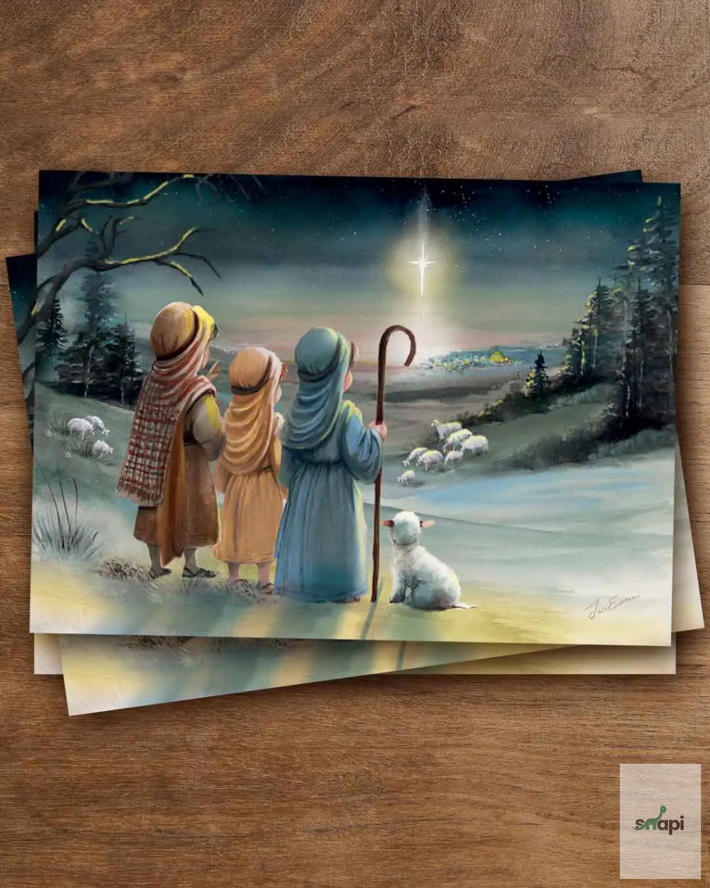 Ez az édes illusztráció a pásztorokat és egy kis bárányt ábrázolja, akik a Betlehem feletti csillagot nézik, így tökéletes karácsonyi kívánságok megosztásához, vagy varázslattal töltik el szezonális asztalát és decemberi dekorációját.