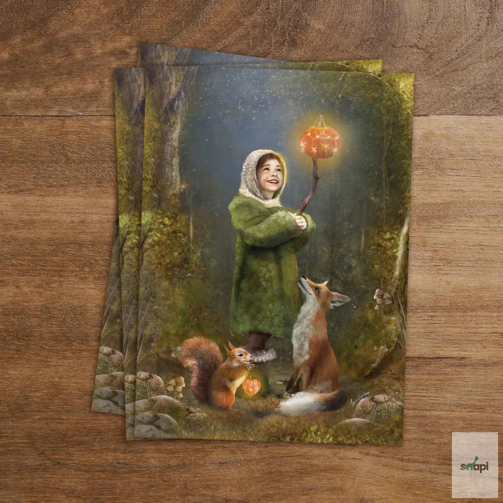 Ez a képeslap a gyönyörű műalkotásokat kiváló minőségű anyagokkal ötvözi, így emlékezetes emléket alkot. A Waldorf oktatás éves ünnepségei ihlették, ez a Waldorf ihletésű képeslap „Márton ünnepét” ünnepli.
