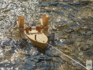 A "pisztráng" hajó lapátkerekeit a víz sodrása hajtja. Eleinte a csónak az áramlattal együtt siklik, letekerve a zsinórt. De amint a zsinór letekerődik, a játékcsónak boldogan evez tovább, csak éppen az áramlattal szemben tér vissza.