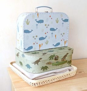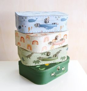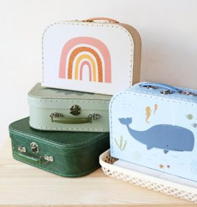 Ez a 2 darabos bőröndszett tökéletes az apró játékok, füzetek, ceruzák és kincsek tárolására. Használhatók utazáshoz, játszáshoz, de akár a gyerekszoba polcán is nagyon jól mutatnak. A bőröndök különböző méretűek, és masszív kartonból készülnek, poliészter varrással. A nagy és a kis bőrönd is színes, fém fogantyúval és zárral rendelkezik, amely biztonságban tartja a kicsi kincseit.
