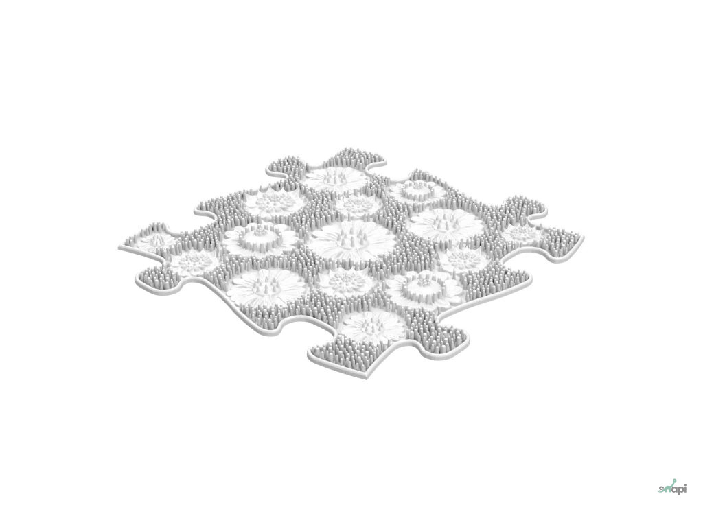 A MUFFIK szenzoros ortopédiai szőnyeg kirakódarabjait a természet elemei ihlették. Kövek, fatörzs, fű, kavicsok, kagylók – ezek mind megtalálhatók az egyes darabokon és annyira élethűek, hogy öröm rálépni.